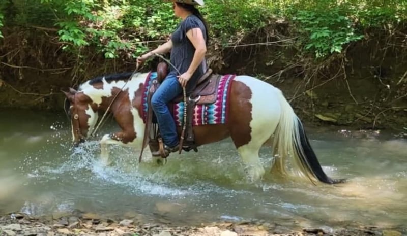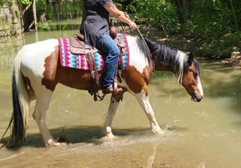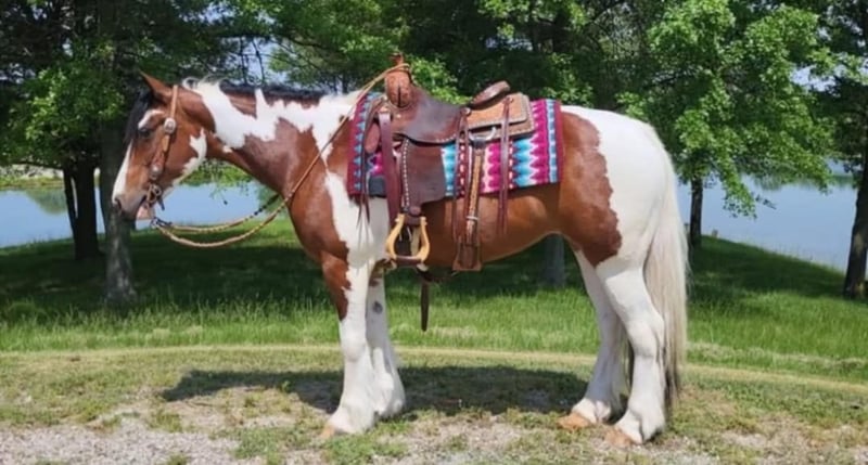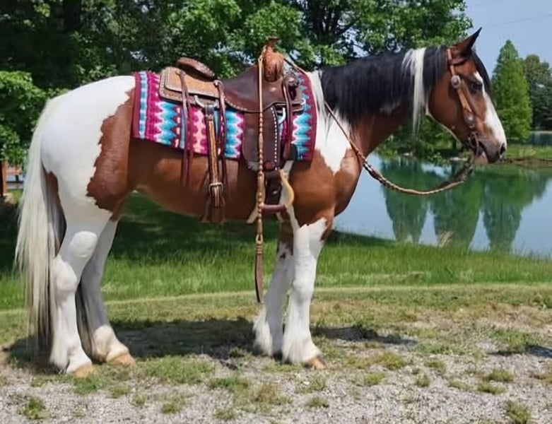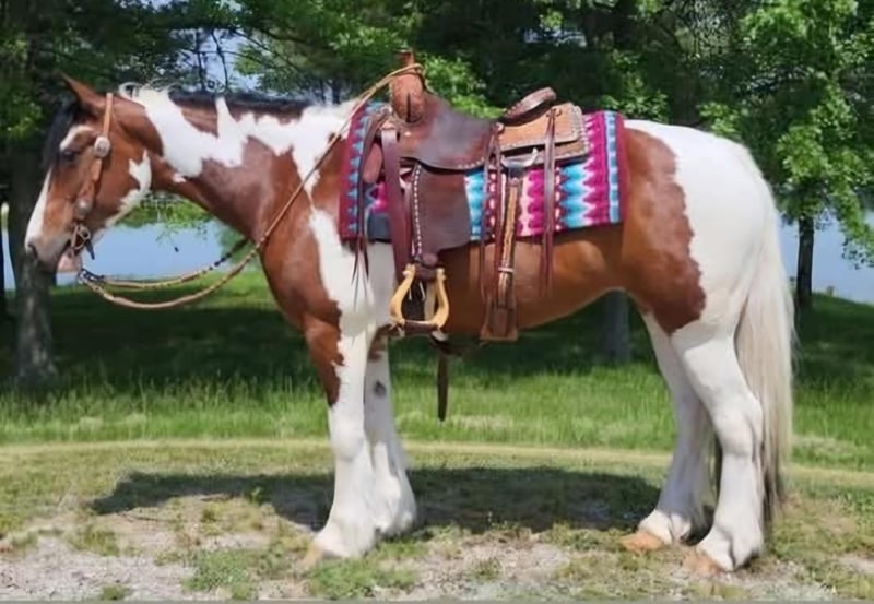ONLINE AUCTION Place your bids at www.PlatinumEquineAuction.com Starting Bid $3500 Auction ends May 4th, 2025 Need a new saddle? Check out White Rock Saddles on our website or Facebook! I’m so excited to present to you Karoline 2017 Gypsy Vanner Cross. She stands 14.2 hands and weighs 1150lbs. She has it all, the gypsy vanner look, but the athletic ability to go in any direction you choose to take her in. Not only is she stunning to look at and a pleasure to be around, she’s extremely broke. Whether you’re wanting to spend the day riding down the trails, doing lessons, pushing cattle, jumping, or just pampering your best friend Karoline is your lady! Karoline has a willing attitude that makes her so special. She has great ground manners that make her incredibly easy to be around. Karoline has had only 2 owners her entire life. I’ve had the privilege of being around her for over two year. We have had her in training for the past year. She is only being offered for sale because a dear friend(owner) has decided she will no longer be riding. We ABSOLUTELY love Karoline. Karoline will ride away from the barn by himself or in big groups. She is always willing to go anywhere you point him and enjoys the trail obstacles. Karoline is broke better then most gypsy, she is not heavy or not dull. She will ride around with or without a bridle, side passes, moves her hips, is soft in the mouth, backs, and is user friendly for any level rider young or old. Karoline is traffic safe and tarps, bull whips, dogs, kids don’t faze her. She will stand all day for grooming and enjoys being pampered. She will also side pass to mounting block, picnic table, log or trailer fender to make mounting easy. Karoline is currently barefoot and has never needed a set of shoes. She stands great for the farrier, saddling, bathing, and clipping. She is easy to bridle as well. She is easy to catch in the feild and prefers to live outside, but also has great stall manners. She sells 100% sound no vices. She is UTD on shots and vaccinations. PPE are welcome. Make an appointment today to try Karoline. Check out her MUST SEE VIDEO Owner Cinthia Bowling, Contact (Agent) Jessica Bunch 434-981-3863 Located in Robards, KY. ONLINE AUCTION Place your bids at www.PlatinumEquineAuction.com Starting Bid $3500 Auction ends May 4th, 2025 Need a new saddle? Check out White Rock Saddles on our website or Facebook!