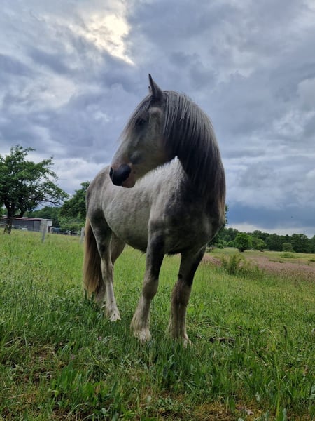 Cooper sucht umstandshalber ein neues zu Hause Cooper ist Anfang Juni 23 geboren, er trägt die Farbe Braunschecke mit Grau, im Endmaß wird er ca bei 145cm liegen. Er hat Papiere vom ICS mit der Abstammung von der Mutter ( Vater ist aber auch Bekannt ) Cooper ist ein ganz lieber Hengst , der absolut keine Hengstmanieren hat. Er lässt sich artig am Halfter mitten durch die Kleinstadt führen. Cooper lebt in einer kleinen Herde im Offenstall. Cooper ist am Unterbauch und den Hinterbeinen kitzlig, daran müsste noch etwa gearbeitet werden. Ganz wichtig!!! Ich bekomme Nachrichten nicht mit , daher bitte unter 0162/9196337 melden. Platz vor Preis!