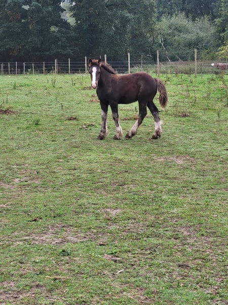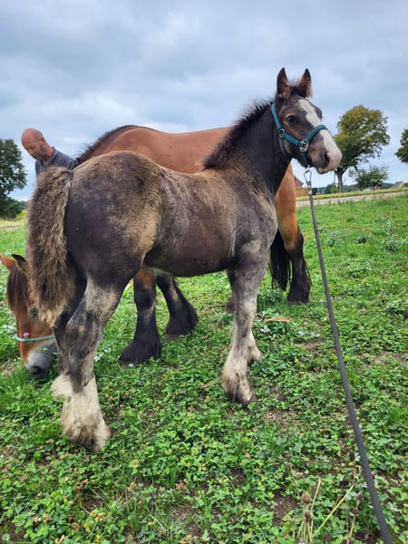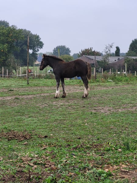 Dieser wunderschöne Kerl sucht noch ein zukünftiges 5*🏡. Carlos ist ein schwarzes Hengstfohlen mit 3 weißen Beinen. Seine Mutter ist unsere Kaltblutstute von 1,57 m (siehe vorletztes Foto), sein Vater ist unser Tinker/Irländer Hengst Meadows Booster von 1,48 m (siehe letztes Foto). Carlos ist jetzt schon ein sehr breites und großes Fohlen, er ist über 3 Monate alt und misst bereits 1,22 m. Wir erwarten, dass seine Schulterhöhe bei etwa 1,55 m liegen wird und er ein breiter, kräftiger Kerl wird. Carlos ist ein echter Freund für jedermann und sehr sozial. Er kommt immer zu dir auf die Weide, liebt jegliche Aufmerksamkeit und ist einfach ein unglaublich entspanntes Fohlen. Er hat fast vor nichts Angst und geht gerne auf Entdeckungstour. So steht er entspannt an der Traktor, wenn wir damit auf die Weide fahren, hat keine Angst vor flatterndem Plastik und man kann die verrücktesten Dinge mit ihm machen. Carlos ist pssm1-frei gezüchtet und wächst in Herdenverband auf. Wenn er umzieht, kennt er sein Fohlen-ABC. Das bedeutet, dass er das Anbinden kennt, am Seil mitläuft, stehen bleibt, geputzt wird, mit Spray vertraut ist und man ihm die Hufe auskratzen kann. Er besitzt zudem einen Pass + Chip, wird regelmäßig entwurmt, beschlagen und hat seine erste Impfung erhalten. Carlos steht in Oud-Sint-Jansberg, Belgisch Limburg. Schreibt gerne eine PN für weitere Informationen.