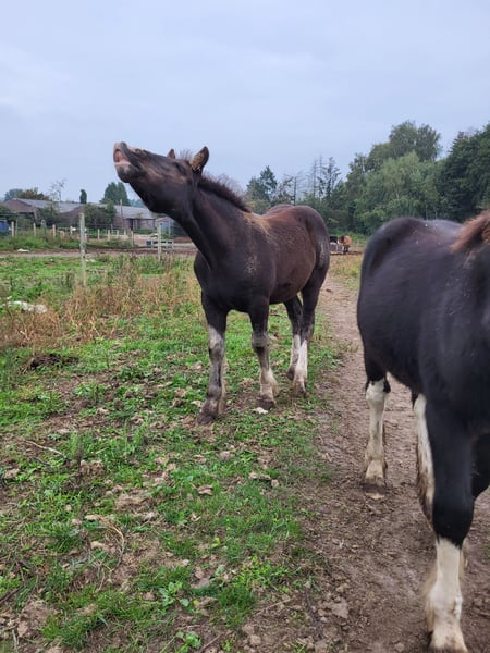 Deze prachtige kerel is nog opzoek naar een toekomstig 5*🏡. Carlos is een zwart hengstveulen met 3 witte benen. Zijn moeder is onze trekpaard merrie van 1.57m (zie voorlaatste foto) zijn vader is onze Tinker/irish cob hengst Meadows Booster van 1.48m (zie laatste foto). Carlos is nu al een erg breed en groot veulen, hij is ruim 3 maanden oud en meet nu al 1.22m. We verwachten dan ook dat zijn schofthoogte rond 1.55m gaat liggen en hij een brede, stoere kerel wordt. Carlos is een echt allemans vriendje en heel sociaal. Hij komt altijd naar je toe in de weide, vind alle aandacht geweldig en is gewoon een ontzettend relaxed veulen. Hij heeft zga nergens bang van en gaat graag op ontdekking. Zo staat hij gerust te snuffelen aan de tractor als we daarmee de weide ingaan, heeft hij geen schrik van wapperende plastiek en kunt de gekste dingen met hem doen. Carlos is pssm1 vrij gefokt en groeit op in kuddeverband. Als hij verhuisd kent hij zijn veulen abc. Dwz dat hij halsteren kent, meelopen aan het touw, vaststaan, gepoetst worden, bekend is met spray en je de hoeven kunt uitkrabben. Hij is dan tevens in bezit van paspoort+chip, regelmatig ontwormd, bekapt en heeft zijn eerste enting gehad. Carlos staat in oudsbergen, Belgisch Limburg. Stuur gerust een pb voor meer info