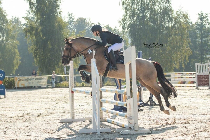 Lisbergs Prince Philip Lisbergs Prince Philip was born on April 10, 2021, at our stud farm. He was born at 5:16 a.m. as a dark bay (rapp-Schimmel). His mother, Mask View Molly, is a well-trained Connemara mare who, before joining us, competed actively in Dutch pony sport, ranging from the smallest classes to 2-star A and A dressage. She carries rare bloodlines, including the popular Glencarrig Prince, Ballyard Prince, and Rocklands Prince lines, with Hazy Dawn blood! Lisbergs Prince Philip’s sire, Pattys Veuve Cosmic, is licensed in Hanover, recognized in Bavaria, and approved in Southern Germany. He boasts excellent bloodlines and achieved an above-average performance test score of 8.2! Additionally, he is a successful competition pony and a well-behaved driving horse, with children and grandchildren worldwide. Lisbergs Prince Philip was raised very carefully at our stud farm, initially in a foaling box with his mother, later in a mixed herd of stallions and geldings. Since foalhood, he has been regularly dewormed and vaccinated against tetanus, EHV1,4 (Herpes), and equine influenza. He has never been ill, and his teeth are regularly checked. Philip was gently lunged, then backed, and in September 2025, he completed his two-day short-term test, also called a performance test, with a score of 6.93. During this test, he was evaluated in free jumping, ridden in a dressage test plus one external rider test, and the next day, he completed a show jumping course plus two additional external rider tests. He was presented at the licensing on November 22 but was not licensed because he leans more towards a sport pony type. Therefore, he is now being offered as a nearly 5-year-old gelding, suitable for pony sport or for experienced young riders or petite adult riders. For the licensing, he underwent a veterinary examination, including flexion tests and dental check-ups. He has not been X-rayed yet, but this can be arranged by the new owner during a pre-purchase exam. Currently, he measures approximately 1.47 m. Lisbergs Prince Philip is ideally suited for pony sport or for well-ridden teenagers or petite adult riders. He is progressing in dressage and show jumping towards A-level, as confirmed by his performance test at the end of September. He is familiar with trail riding, some indoor training (needs further practice with multiple riders in the arena), grooming box, braiding, solarium, transporter and trailer loading, including longer distances, riding arena, various stable facilities for training, and has no bad habits. He is well-behaved and remains calm in turnout. Currently, Lisbergs Prince Philip is waiting for his castration, which has been delayed several times due to the veterinarian’s illness and emergencies. If you are interested in Lisbergs Prince Philip, please contact the numbers provided in the listing directly. When emailing, kindly include your name and mobile phone number. You can also reach us via WhatsApp at 00491713415878, as mobile reception in our beautiful village is unfortunately poor or unavailable. The complete pedigree can be found in the documents, as ehorses often truncates parts of the lineage. We charge a discovery fee of €50 per visit to our farm, and €70 on Sundays and public holidays, payable in cash upon arrival. Best regards, and maybe see you soon – Lisbergs Stud Farm is always worth a visit! Thank you for your interest! Your Lisbergs Stud Farm