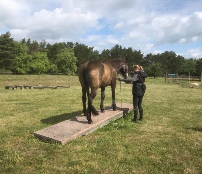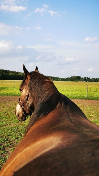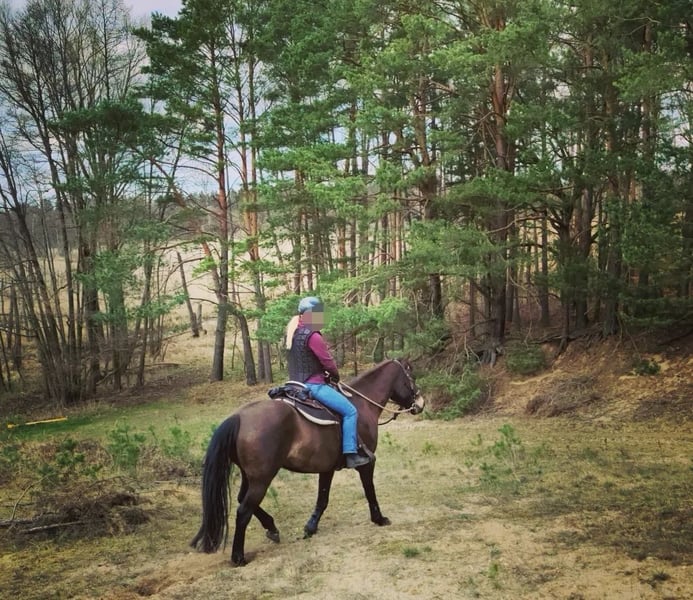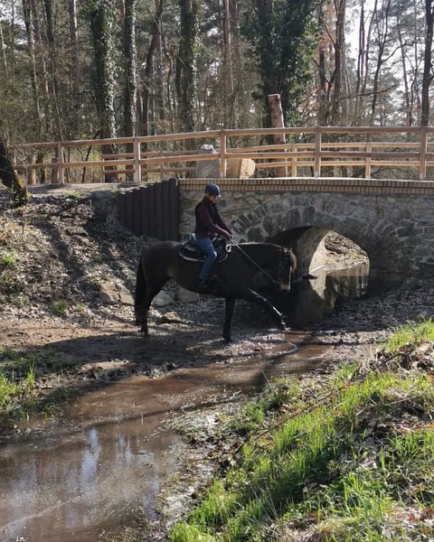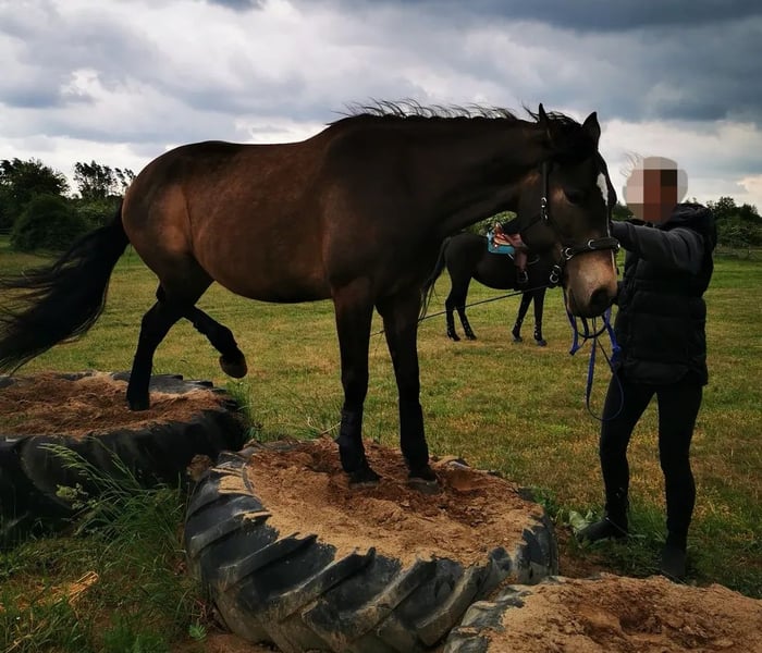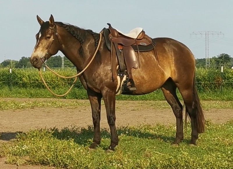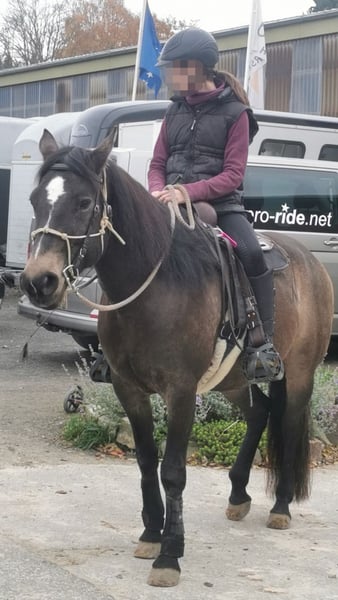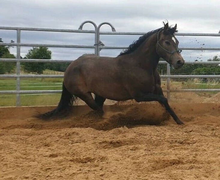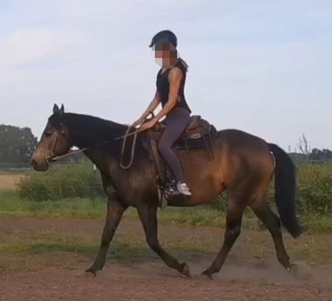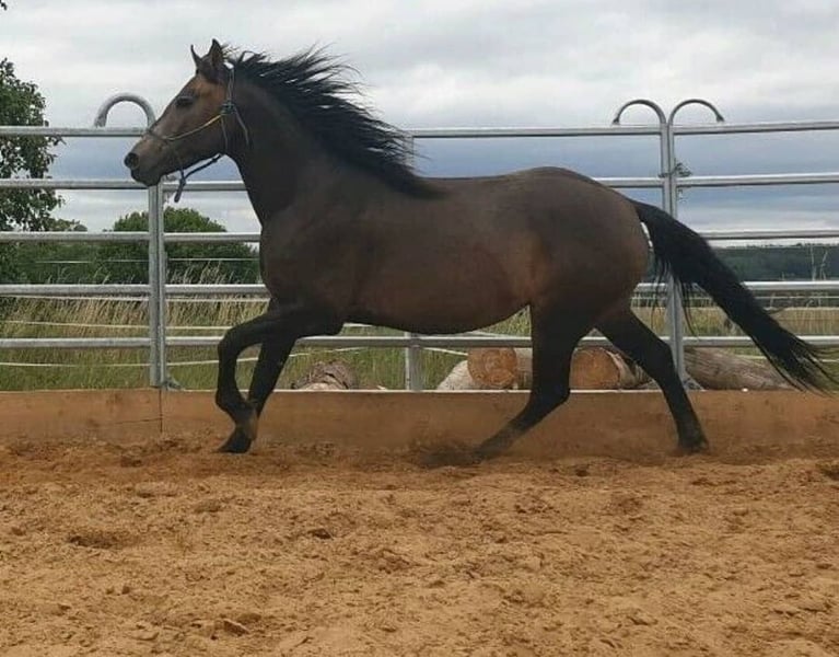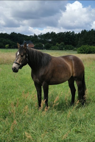 Besonderheiten vorweg (bitte aufmerksam lesen): PSSM1 n/p1 und MIM n/Px (vom Vollblut) positiv getestet, PSSM1: in meinem Besitz symptomfrei und ohne Belastungsintoleranz durch passende Fütterung und viel Bewegung, PX: sportlich-ausdauernd, reizsensibel, schreckhaft - daher nicht für die Zucht geeignet! Grunddaten: Connemara x Vollblut Stute (ohne Papiere), geboren 2016 | 1,56 m, Dunkelfalbe mit voller/m Mähne/Schweif, Preis: VB, jedoch „Platz vor Preis“ Ausbildung & Entwicklung: Die Stute wurde 2020 roh von mir (ausgebildete Pferdeverhaltenstrainerin IVK) gekauft und seit 2021 mit viel Geduld, Fachwissen und Gefühl schonend im wöchentlichen Beritt (Gelände und Platz) geritten sowie vielseitig und nachhaltig am Boden ausgebildet. Ihre Ausbildung basiert auf der Pferdeverhaltenslehre von Dr. Vivian Gabor & Dr. Sandra Ruzicka (Institut für Verhalten und Kommunikation) und wurde durch 12 intensive Praxiseinheiten 2023+2024 vertieft. Zuletzt war sie im Herbst 2025 für zwei Monate im Profiberitt (ProRide), wo gezielt an der Durchlässigkeit im Galopp gearbeitet wurde und sie sich nochmals deutlich weiterentwickeln konnte. Unter dem Sattel: reitweisenfrei unter Westernsattel/Reitpad, mit/ohne Gebiss, am Kappzaum/Knotenhalfter, drei sehr angenehme Grundgangarten, auf Außenplatz: angenehmes Go, umweltorientiert, in Halle: angenehmes Go, sehr konzentriert, im Gelände: motiviertes Go, ausdauernd, auf freiem Feld sehr umweltorientiert und angespannt, im Wald deutlich entspannter, sehr trittsicher, allein in allen 3 GGA & in ruhiger Gruppe bisher Schritt+Trab, 15 km+ kein Problem, sehr fein an Zügel und Stimme geritten, benötigt viel Bewegung mit klarer, sicherer & fairer Führung, sonst schnell verunsichert, reagiert sehr sensibel auf klappernde Geräusche an Kleidung/Sattel, ist ruhig im Straßenverkehr und mit Hunden um sich herum Sie ist nicht geeignet für Anfänger, Kinder, Wiedereinsteiger, sondern ausschließlich geeignet für sehr erfahrene, sitzsichere, angstfreie, faire Reiter Charakter & Bodenarbeit: sehr höflich, sensibel, fein, jedoch auch temperamentvoll, braucht ihre Zeit für Vertrauen, keine Unarten (Beißen/Steigen/Treten), sehr intelligent, lernwillig, mag ruhige, strukturierte, konzentrierte Arbeit, neigt bei Stress/Überforderung zu Panik, ist vielseitig ausgebildet: Seitengänge, Kontervolten, Freiarbeit, Stangenarbeit, spanischer Schritt, Longenarbeit ohne Hilfszügel, Podest-/Wippenarbeit, Gelassenheitstraining uvm., fährt problemlos Anhänger Haltung: lebt seit 2020 in gemischter Herde als freundliche, souveräne Leitstute im Offenstall, braucht Bewegung, Freiheit, Sozialkontakt, Haltung in Box nur kurzzeitig möglich, sonst depressiv Gesundheit: Ohrgrundfistel-OP 2020 & Griffelbein-OP 2022 – ausgeheilt (Kontrollen 2023 & zuletzt vor Beritt 2025 ohne Befund), Zähne regelmäßig gemacht (Zahnpass vorhanden), Impfungen seit 2025 auf Tetanus reduziert, Entwurmung nach Labor, bedarfsweise Vorstellung bei Körpertherapeuten, läuft barhuf auf regelmäßig bearbeiteten robusten Hufen Gesuchtes Zuhause: Platz auf Lebenszeit im Offen-/Aktivstall mit Sozialkontakten, naturnaher & zuckerarmer Fütterung, mit fairem, ruhigem, gewaltfreiem Umgang und klaren Strukturen in ausschließlich erfahrenen Händen. Besonders gut kann ich sie mir bei Reitern der Légèreté vorstellen, da ich hier durch ihren klugen Kopf und gesunden, tragfähigen Körper das größte Potenzial zur Entfaltung sehe, oder bei einem Menschen, für den das Reiten nicht im Vordergrund steht. Ich verkaufe die Stute nicht aus Not, nicht an Pferdehändler oder Reitschulen und nicht an unbedachte Käufer. Hast du einen Lebensplatz frei und siehst dich diesem Wesen gerecht werden in der weiteren Förderung, gilt „Platz vor Preis“. Aufgrund von Reittourismus berechne ich fürs Probereiten 40 €, die im Falle eines Kaufes erstattet werden. Melde dich bitte nur, wenn du ALLES gelesen hast und bei wirklich ernsthaftem Interesse - ich freue mich auf deine Nachricht.