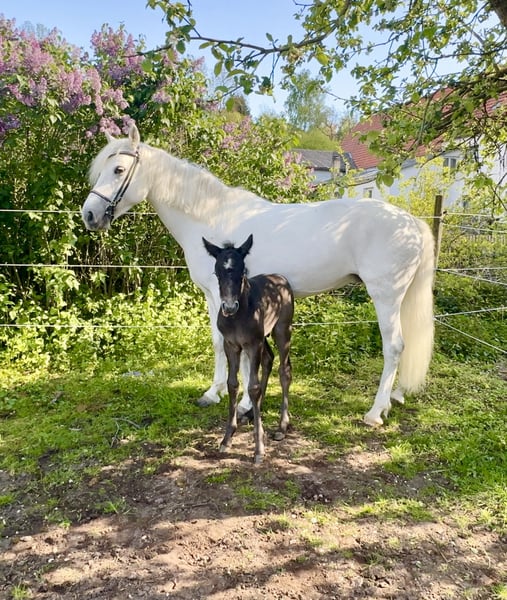 Cooperbeech Dutchess Cooperbeech Dutchess was born on 28.02.2018 at the famous and very well-known but fine Cooperbeech Connemara stud farm of Tomas and Fiona Grimes in beautiful Ireland. Cooperbeech Dutchess, came to us at our Lisbergs stud at the age of 2. Dutchess, as we call this beautiful gray mare with a final height of 1.47 m, is a dream, she loves people more than her own child. Dutchess had split a cheek tooth when she was 4 years old, which was removed from the inside at the "Stephansmühle" veterinary clinic, the aftercare and rinsing was carried out by the Bamberg veterinary clinic. That was many years ago without any consequences. Like all our horses, we have her dentally examined and treated once a year. Dutchess successfully passed her performance test in Ansbach on 16.11.2022 with a score of 7.18, she was ridden bitless until 2 days before the test due to her dental surgery and still felt a little uncomfortable with the double-broken ring snaffle at the time. Today, this is no longer a problem and Dutchess performs superbly with and without a bit at a good A dressage level. Dutchess is a registered broodmare and had a beautiful, very good, healthy colt by our Lettermuckoo Hazys in 2024. The little Lisbergs Hercules was weaned in October. As his mother loves people more than her own child, we have decided to sell our Dutchess as a Connemara riding pony! Unfortunately, shortly before weaning, little Hercules bit off the tails of all the broodmares in the loose stable one night. These are now growing back on every mare and this is unfortunately still clearly visible on Dutchess. Cooperbech Dutchess is a daughter of the very well-known GLENCARRIG KNIGHT, a stamp stallion of the Irish Connemara breed. Her dam COPPERBEECH STAR descends from CLONBERNE BOY a VILLAGE BOY son on her sire's side and from CURRACHMORE CASHEL and GLENCARRIG PRINCE on her dam's side, just to name a few very well-known ancestors in her pedigree. Dutchess's parents are both Class 1 and HWSD N/ N is registered in the 1st main studbook of the Hanoverian Pony and Small Horse Breeders' Association. Dutchess has no sweet itch or other abnormalities such as weaving or bucking! Dutchess travels very confidently with horse transporters or in trucks! She is an ideal pony for people who would like to have a larger and compact pony later on. Dutchess is a real Irish lady, always friendly - in the group she has good social behavior and avoids quarrels, but does not allow herself to be "bullied". Dutchess has beautiful ground-covering gaits and a very fine character in the open stable group and in the panel stall stable, she is vaccinated with EHV1.4 as well as tetanus and equine influenza and regularly dewormed. Due to her size, Dutchess is suitable for pony sport, pony games and, due to her calm nature, also for the therapeutic part of riding, as well as a riding horse for larger riders, as she is very sturdily built. The break and the later breaking in did her a lot of good both mentally and physically. Don't forget that Connemara ponies are not fully grown and developed until they are 7-8 years old, so age-appropriate riding is a guarantee that you will enjoy your pony for a long time! Well cared for Connemaras are long-lived and 30 years is not uncommon for the breed! Dutchess is well lunged and well ridden according to her age! However, we see Dutchess more as a dressage pony or family or therapy pony or show pony, as she knows how to present herself. Dutchess is barehoof! Dutchess loves to move in nature! She is super relaxed when mounting and dismounting! Due to her good character and friendliness towards other horses and dogs, she would also be a good safe cross-country horse for a not so strong rider with a dog or for riding hunts! Of course Dutchess also goes out alone, can be ridden to and from a group and comes home with the rider on her back! She is road-, cross-country- and traffic-safe even with weaker riders. Dutchess walks and trots well and also canters off-road, but in our small indoor arena and in the arena it is still difficult for her to canter with a rider for a long time due to her lack of muscles and ballance (mother time!)! If you like Cooperbeech Dutchess, please contact us directly at the numbers given in the ad and include your name and mobile phone number in an email - you are also welcome to contact us directly via WhatsApp at 00491713415878, unfortunately mobile telephony does not work or only very poorly in our beautiful town. On the last picture you can see Dutchess father Glencarrig Knight. The complete pedigree can be found in the documents, as ehorses often swallow parts of the pedigree. We charge an introductory fee of 50€ per visit to our farm and 70€ on Sundays and public holidays must be paid in cash in advance on arrival! Best regards and maybe see you soon - Gestüt Lisbergs is always worth a visit! Lisbergs Stud