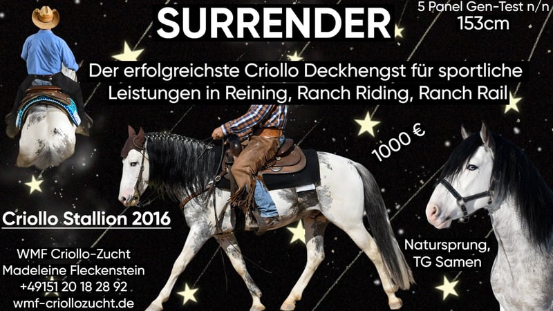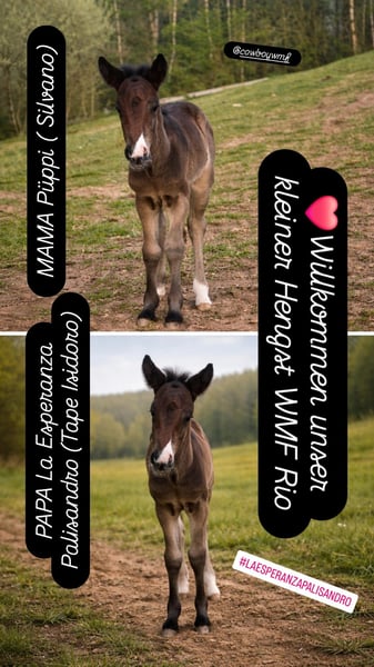 Rio – vielversprechender Junghengst mit Top-Abstammung Mit WMF Rio präsentieren wir einen außergewöhnlich typvollen und vielversprechenden Fohlenhengst, der sowohl züchterisch als auch sportlich keine Wünsche offenlässt. Rio stammt ab von unserem bewährten Deckhengst La Esperanza Palisandro dessen Wurzeln aus dem hocherfolgreichen Tape Isidoro stammen. Auch mütterlicherseits überzeugt seine Abstammung: Die Criollo-Linie steht für Qualität und Leistungsbereitschaft. Besonders hervorzuheben ist sein Großvater – der gefeierte Hengst des Jahres 2023 für sportliche Leistungen, Surrender. Bereits jetzt zeigt WMF Rio alles, was man sich von einem zukünftigen Sport- oder Zuchtpartner erhofft: Ein stämmiges, kräftiges Fundament, starke und korrekte Beine sowie ein harmonisches, ausdrucksstarkes Exterieur. Sein dichter, imposanter Schweif erinnert deutlich an seinen Vater und rundet das Gesamtbild eindrucksvoll ab. Doch nicht nur optisch überzeugt Rio – auch sein Charakter spricht für sich: Er präsentiert sich als agiler, ausgeglichener und äußerst menschenbezogener junger Hengst, der mit seinem charmanten Wesen sofort begeistert. WMF Rio ist eine echte Bereicherung – sowohl für ambitionierte Züchter als auch für Sport- und Freizeitpartner, die Wert auf Qualität, Ausstrahlung und ein verlässliches Interieur legen. Der hübsche junge Mann ist am 20.04.2026 geboren und kann nach dem Absetzen in sein neues zu Hause. Bei Interesse gerne anrufen oder schreiben.