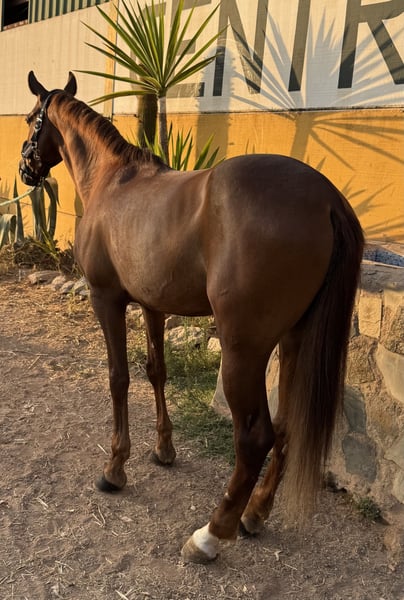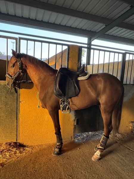 Hispano-Arabian horse (sired by an Arabian and out of a Spanish mare) with 7 years of age, passport, and measured at 1.61 meters with a measuring stick. This horse has participated in all kinds of events, fairs, Rocío, candelarias, etc. He is advanced in vaquero dressage: basic training, lateral movements, supports, direct and reverse pirouettes, half-passes, isolated changes of lead. He has competed several times in the young horse class. He is completely healthy and has never had any injuries, but I still accept a veterinary examination. He is located in Guarromán (Jaén). Curious inquiries will be ignored; this is not a cheap horse.