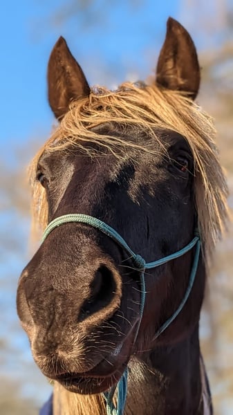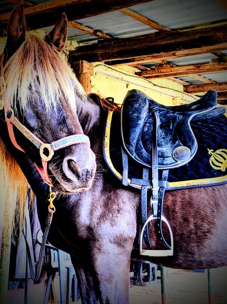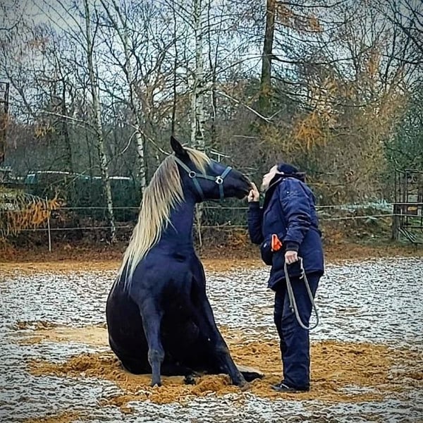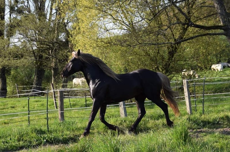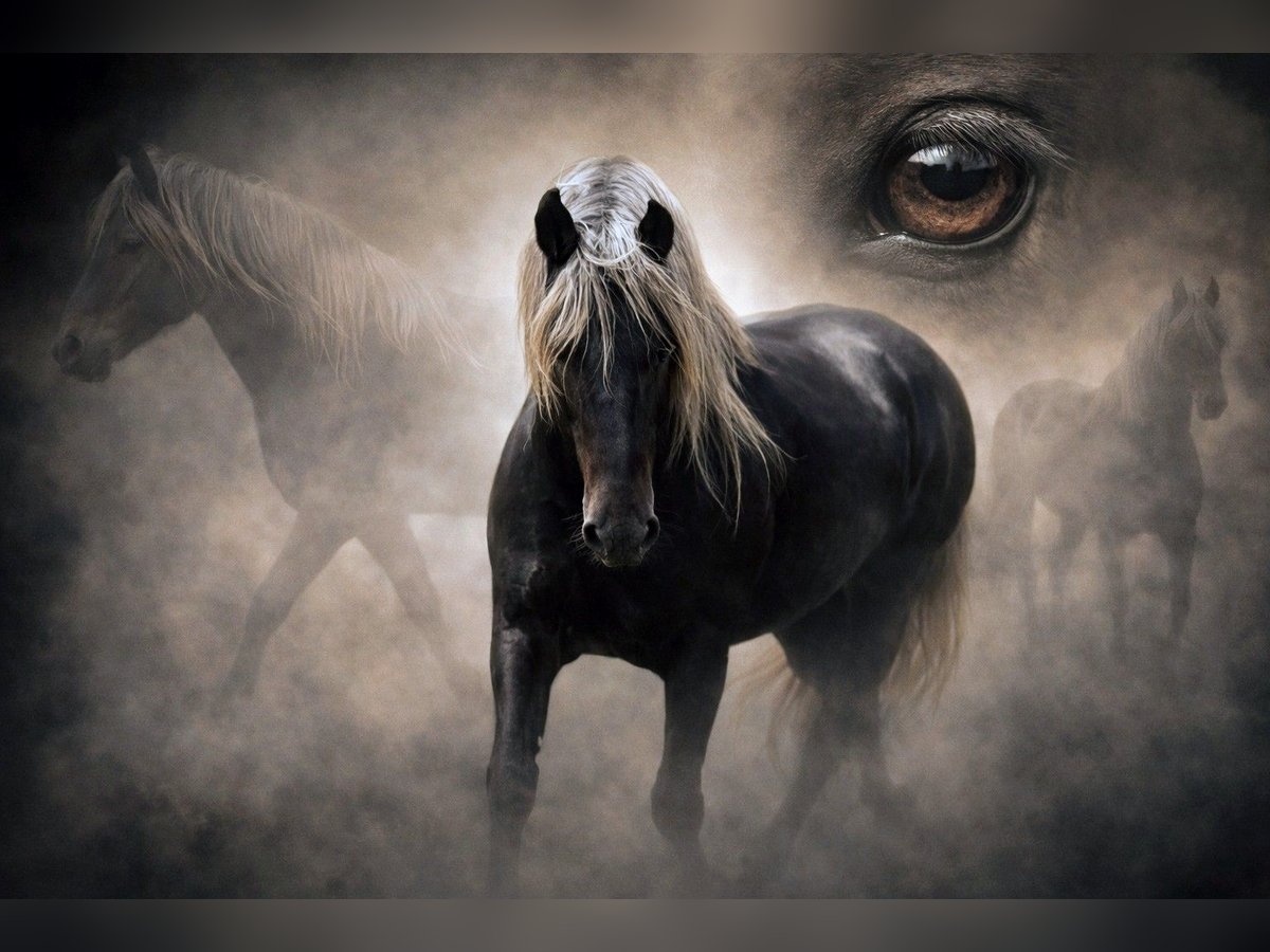 Galaan captivates with his presence and, of course, his striking color. A spirited gelding with a sunny disposition. He learns quickly and enjoys circus tricks and groundwork. In the arena, he moves confidently in all three basic gaits, and his maternal lineage also predisposes him to tölt. Born on June 10, 2016. His sire is a PRE, his dam is a RMH. The pedigrees of both can be seen in the photos. If interested, I can also send more pictures of his dam and sire, as well as photos of Galaan as a foal and young horse. Galaan is an honest horse who can read his rider well. He is very people-oriented once he has bonded, though you need to earn his trust. He can perform Spanish walk, piaffe, lie down, etc., from the ground. He can also fetch. He is highly intelligent and sensitive. Color: windfarben (wind color). Tested negative for PSSM2. Healthy and lively. More of a hippie than a workaholic. With a second horse he trusts, he goes well out on the trail. When alone, he can be cautious and prefers not to go. Walking is no problem. Galaan is a real eye-catcher and a true gem in character. He is part of a gelding herd and is very social and compatible. A special horse for a special rider. !On Instagram under negroplatero, there are more photos and videos of him! Galaan comes directly from his breeder to me and is completely unspoiled in character. He was raised by her, learned the foal basics with love and patience, and was her breeding stallion until she shifted her focus to breeding Arabian Mountains instead of Hispañimountains. Then he came to me. I backed him at age five, not because he was unmanageable, but because I couldn’t provide him with a proper life as a stallion. I am only offering Galaan for sale because he needs a strong rider he can trust. I could tell you a lot about this wonderful horse — it would fill volumes. But if you are the right person for him, I’d be happy to share more. Only WhatsApp! Place before price.