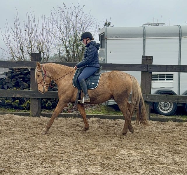 Zum Verkauf steht eine 4,5 Jahre alte, etwa 151cm große Stute in der tollen Farbe Dunalino ohne Abstammung. Sie ist gut freizeitmäßig geritten und zeigt sich sehr talentiert bei der dressurmäßigen Arbeit auf dem Reitplatz. Kleine Sprünge meistert sie auch ohne Probleme. Dies kann natürlich noch weitere ausgebaut werden. Sie zeigt keine Unarten unter dem Sattel und ist ziemlich einfach zu reiten. Daher wäre sie bestimmt auch für eine Reitschule interessant. Im Umgang ist sie ebenfalls absolut unkompliziert und brav. Sie lebt bei uns im Offenstall und ist sehr verträglich auch in der gemischten Herde. Sie kann robust gehalten werden, kennt aber auch die Box. Krankheiten oder Allergien sind nicht bekannt. Eine AKU darf gerne gemacht werden. Für das Probereiten, Vorreiten oder anderes Ausprobieren des Pferdes berechnen wir 35€. Beim Kauf wird dies gutgeschrieben. Gerne anrufen oder eine Nachricht senden 0157 36803742 Alle Angaben ohne Gewähr, Preisänderungen vorbehalten, Transport möglich, Onlinekauf möglich