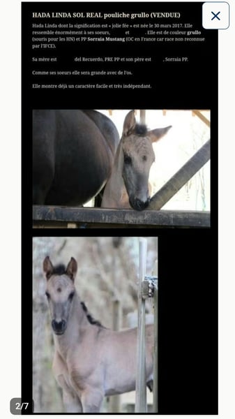 Hada Linda Sol Real, Allbreed-Stammbaum, Spanish Mustang Registry/hada+linda+sol+real (Informationen zu ihrem Stammbaum über Google) Züchterin: Emanuelle Gallouet. lacastelleraie: elevage-de-chevaux/poulains-vendus/hada-linda-sol-real-pouliche-grullo Grullo 1,60 m Stute 2017 Im Alter von 2 Jahren für 5000 € gekauft (Vertrag vorhanden). Preis verhandelbar (3750) für ein sehr gutes Zuhause und jemanden, der eine Verbindung zu ihr aufbaut. Ist eine sensible, sehr liebe Stute mit Charakter (Sorraia x PRE APTA), die gerne Aufmerksamkeit bekommt. Hat bereits 2 kräftige Fohlen zur Welt gebracht, von denen eines auf eine unglaubliche Zukunft als Turnier- und Expeditionspferd vorbereitet wird. Hada hat einen sensiblen Charakter, lässt sich aber gut führen. In diesem Winter wurde mit der Sattlung begonnen. Lädt gut auf LKW und Anhänger. Wird auf Wunsch vollständig sattelbar abgegeben. Ich selbst habe 5000 € für 2 Jahre bezahlt, aber dieser Preis ist für ein gutes Zuhause verhandelbar. Grund für den Verkauf: Ich darf hier nur 4 Pferde halten und verkaufe 3 Pferde, die ich nicht selbst gezüchtet habe, um im September die gesetzlich zulässige Anzahl einzuhalten. Das fällt mir sehr schwer, vielen Dank für euer Verständnis