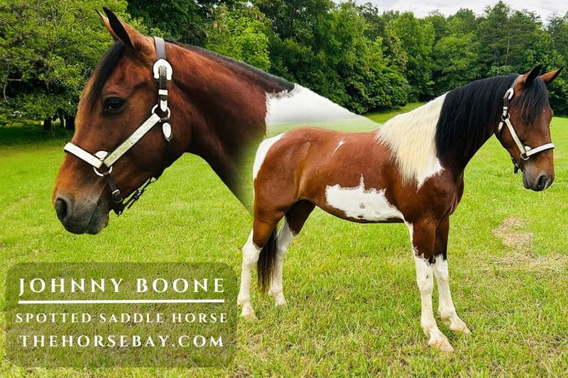 Everyone, meet Johnny Boone! A stunning 9-year-old spotted saddle horse gelding. He is registered with the National Spotted Saddle Horse Association. Johnny Boone is a beautiful bay tobiano with a thick, flowing, mixed mane and tail. He stands a sturdy 15hh. If you’re in the market for a reliable trail mount, consider Johnny Boone. While we have had Johnny Boone around, he has been a pleasure to handle and ride. He pastures and stalls well. He easily comes to the barn, to you, loves being petted, and getting your attention. Johnny Boone is cooperative with the farrier and the veterinarian. He is quiet and easy to groom, tack up, bridle, etc. He also loads and backs off the horse trailer with no problem. Johnny Boone stands to be mounted from the ground or a mounting block. He has no trouble riding away from the barn, alone, or with others, front, back, or middle. He has extensive trail experience, along with numerous camping trips on his resume. The only thing I can find to criticize him on is that he dislikes being sprayed with fly spray. I simply put the fly spray on a towel and wiped him down with no trouble. This is nothing major, but I want to note it. I have ridden Johnny Boone down highways with traffic, through trails, creeks, and mud puddles, and passed dogs on our route, all while encountering wildlife, with no issues. He is content to walk on a loose rein if that is what you desire, or he can step out into his nice gait if you ask. He has a nice square 4-beat gait. Johnny Boone has the beauty, brains, gait, and experience that many people look for. I am happy to be presenting him. He is an easy keeper and has a chunky build. He is UTD on coggins, vaccinations, farrier (he is keg shod), deworming, and he has a clear health exam from the veterinarian. Johnny Boone is a healthy horse that is ready to hit the trails! We have put together a nice video for you to meet Johnny Boone virtually, but if you’re interested, I encourage you to meet him in person as well. Feel free to call or text me with any questions regarding Johnny Boone!
