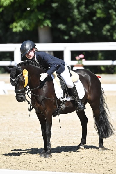 Sie ist ein tolles von Kindern gerittenes Pony mit eigenem Kopf. Mit unseren Töchtern ist sie von Führzügel bis Dressurreiter WB gestartet und war hier immer anständig und platziert. Im Umgang ist sie lieb und lässt sich auch von Kinder führen/ aus der Box holen. Aufgrund einer Schimmelpilz-Allergie benötigt sie bedampftes Heu und sollte in einer Paddockbox oder im Offenstall stehen. Aktuell steht sie in einer Paddockbox, hier haben wir ihre Allergie gut im Griff und sie benötigt keinerlei Medikamente.