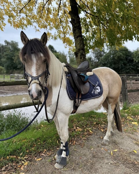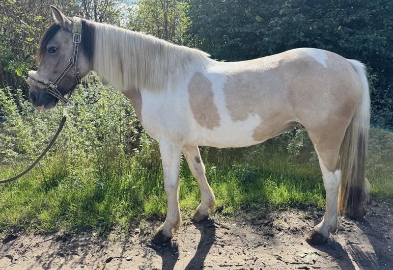 Porcelain-checked mare with Dartmoor papers, 5 years old, seeking a loving home. Name: Betty Breed: Dartmoor Pony Color: Beige and white pinto Height: approximately 14.1 hh Age: 5 years Gender: Mare The beautiful Dartmoor mare Betty is a real eye-catcher and impresses with her gentle, reliable nature. Character: * Sweet, dependable, and fearless * Initially a bit shy and needs time to build trust * Forms a close bond with her handler through patience Special features: * Barefoot and absolutely easy-going with the farrier * Loadable and well-behaved in daily handling * Ideal for leisure riders looking for a sensitive and loyal partner For Betty, I am looking for a caring home where she can take her time to settle in and where her gentle nature is appreciated. Reinings videos and additional photos are available. If interested or if you have any questions, please feel free to contact me. To avoid riding tourism, I kindly ask for a fee of 30 euros for a trial ride.
