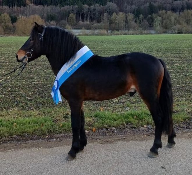 I am selling my beautiful 3-year-old dark brown Dartmoor stallion, "Hells Hadrian." The young gentleman was raised appropriately in a small herd of stallions on summer pasture and has shown to be fence-shy, but is farrier- and loading-friendly. He is also familiar with stable life from the winter. Hadrian was recently licensed by the BZVKS. He is a premium stallion and was the reserve champion of the leisure pony breeds. His height is 122 cm. Although he is a cuddly and affectionate horse when relaxed, he is not a child's pony but a breeding stallion!!! It is his destiny to remain a stallion and to enrich the Dartmoor breed! Serious inquiries only, to loving breeders within Germany.