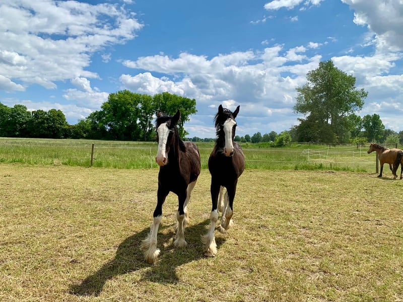 Shire Horse Stute, geb. 2024, aktuell ca. 1,65 m (im Wachstum) – ruhig, neugierig & absolut gelassen Schweren Herzens- Aufgrund veränderter Umstände suche ich für meine junge Shire Horse Stute ein passendes, langfristiges Zuhause. Kein Notverkauf. Sie ist eine sehr ruhige, ausgeglichene und neugierige Stute, die sich durch ihre Gelassenheit besonders hervorhebt. Neue Situationen werden von ihr aufmerksam und interessiert erkundet, ohne dabei hektisch oder panisch zu reagieren. Im Umgang zeigt sie sich freundlich, verschmust und menschenbezogen. Sie genießt Aufmerksamkeit, lässt sich sehr gerne putzen und sucht auch aktiv die Nähe zum Menschen. Für ihr Alter bringt sie bereits viel mit: – kennt Bodenarbeit und erste Gelassenheitsübungen – lässt sich problemlos führen und anbinden – Tierarzt und Hufschmied sind kein Problem – kennt Hunde, Kinder, Autos, verschiedene Umweltreize, Wasser, Plane, Schirm etc. Alleine spazieren gehen ist problemlos möglich. Sie wächst im Herdenverband auf, ist rangniedrig und sehr verträglich. Im Wesen ruhig und eher introvertiert: In unsicheren Situationen bleibt sie zunächst stehen und beobachtet. Mit ruhiger, klarer Führung gewinnt sie schnell Vertrauen und lässt sich sicher durch neue Situationen begleiten. Für ihr Alter sehr gelassen und grundsätzlich auch für Anfänger geeignet – das junge Alter sollte jedoch berücksichtigt werden. Freizeit-, Aufzucht- sowie späteres Reit- oder Fahrpferd. Rappe mit vier weißen Abzeichen an den Beinen und schönem Behang Aufgrund der Größe der Eltern (ca. 1,90 m) ist von entsprechendem Endmaß auszugehen. Transport ist gegen Aufpreis möglich. Zubehör kann ebenfalls gegen Aufpreis übernommen werden. Regelmäßig geimpft, entwurmt und gesundheitlich ohne Befund, Barhuf, Pass vorhanden. Gravel Pit Trudy - Rappe Vater: Gravel Pit Lord Ashby - Rappe Mutter: Gravel Pit Amper - Rappe