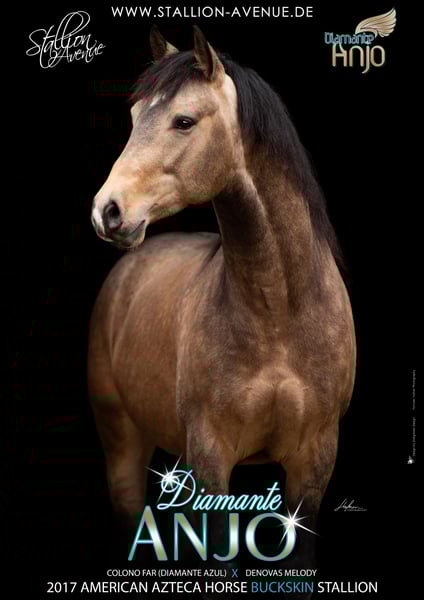 Diamante Anjo is een prachtige en volledig geregistreerde vertegenwoordiger van de Azteca Horses. Een slim, werkwillig paard met expressieve bewegingen en een uitzonderlijk karakter. Zeer mensgericht, moedig en getalenteerd, presenteert hij zich zelfverzekerd in overeenstemming met het fokideaal. Rasinformatie over het "Azteca Paard". Het "Azteca Horse" lijkt op de Spaanse en Noord-Amerikaanse rassen en is een licht en veelzijdig rijpaard van middelmatige grootte. Het hoofd van het "Azteca Horse" is droog en fijn, het profiel is meestal recht of licht convex. Kleine, heldere oren en mooie ogen ronden de indruk van het hoofd af, dat volgt op een sterk gespierde en mooi gewelfde hals. De schoft is slechts matig geprononceerd en volgt op een lange en schuine schouder. De korte en goed gespierde rug gaat zachtjes over in een lang, licht hellend kruis. De stabiele en sterke romp wordt gekenmerkt door diepte en breedte. Het fundament is extreem stabiel met droge gewrichten en overwegend kleine, harde hoeven. Het mechaniek is elegant, maar toch zeer zekervoetig en wendbaar.