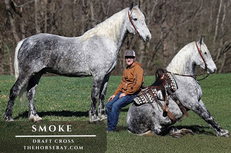 Dapples the size of apples! Just try to count the dapples on this guy! Smokey is a stout-built draft cross gelding standing around 15.2hh. He will weigh 1250lbs, is 9 years old, and has that super pretty dapple grey coloring with a silver mane and tail! He is one cool-looking guy! Not only does he look cool, but he also has all of the other boxes checked… he is Mr. Personality, as friendly as they come, loves attention, and is very calm-natured. Smokey has been in our program since last year and has completed the natural horsemanship training and does some liberty work and he also knows some tricks, he will bow, lay down and set on his rump. Every member of our family has ridden Smokey, all the way down to our 7-year-old. Smokey is great on trails, and he will cross creeks, ditches, logs, and navigate rough, rocky areas. He has a smooth jog, a VERY VERY nice, easy-to-set lope, a good stop, turns a circle both ways, and backs with ease! He has been exposed to all kinds of wildlife, such as deer, turkey, cows, and dogs, and will go anywhere he is asked to. He has ridden many miles in the mountains of Eastern Kentucky and encountered every obstacle possible on the trail. He will go up or down even the steepest slopes, across deep creeks, over downed trees, and over all types of rough terrain while still being sure-footed. Smokey is not cinchy, cold-backed, and does not crib or weave. In addition to riding, Smokey has also been driven down the highways. Smokey is a super cool horse that anyone is sure to love!!