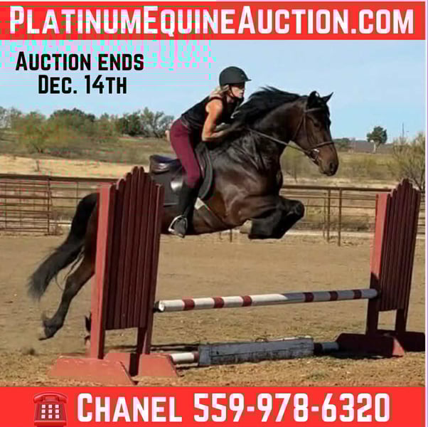 ONLINE AUCTION Place your bids at www.PlatinumEquineAuction.com Starting Bid $3500 Auction ends December 14th, 2025 Need a new saddle? Check out White Rock Saddles on our website or Facebook Remington is a coming 4 year old draft cross gelding standing 16 hands. He is stunning, elegant, an extremely fancy mover, and very athletic. This horse begs to be under English tack and flies over fences like he was born to do it. Remington has a ton of natural collection. He is forward moving and has an amazing jog with a massive extended trot. Remington is an outstanding dressage, fox hunting, or even hunter prospect. He is incredible on the ground, quiet, extremely well mannered and personable. Remington is also very enjoyable out on the trail. He is confident and will go anywhere you point him. He is very sure footed and can go all day long. Remington is great in a herd setting, easy to catch, an easy keeper, and great for the farrier. Remington is always consistent, never offered to buck, never given us any trouble and he is just an old soul at heart! He has a lot of potential and we would love to see him go somewhere that will teach him to showcase it! He is sound, straight and clean legged. He is broke to drive as well. FMI call/text Chanel with Holland Horse Company 559-978-6320. ONLINE AUCTION Place your bids at www.PlatinumEquineAuction.com Starting Bid $3500 Auction ends December 14th, 2025 Need a new saddle? Check out White Rock Saddles on our website or Facebook