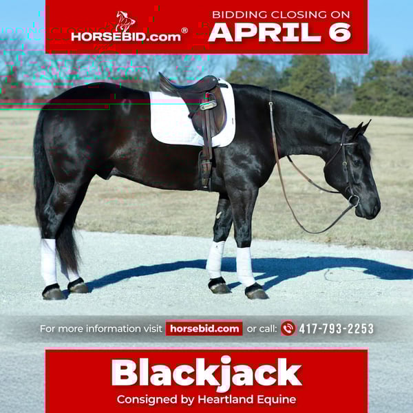 🌟𝑨𝒑𝒓𝒊𝒍 𝐀𝐋𝐋 𝐒𝐓𝐀𝐑 𝐋𝐈𝐍𝐄𝐔𝐏🌟 Happening now thru MONDAY | APRIL 6th - Available EXCLUSIVELY on HorseBid's website! For more details and to register visit: www.Horsebid.com CONSIGNOR CONTACT: Heartland Equine 417-793-2253 LOCATION: Mt Vernon, MO BREED: Draft cross REGISTERED: No REGISTERED NAME: Blackjack COLOR: Black HEIGHT: 15.1 AGE: 4 GENDER: Gelding Blackjack is a 4 yr old draft cross gelding that stands a handy 15.1 hands and is build to last a lifetime. He has the density of a draft horse but carries himself like a quarter horse and takes everything you throw at him like a champ! Blackjack was born right here on our farm and has been part of our family since day one. His sire was a big beautiful blue roan Percheron that we also raised and trained and his dam is a cute little black mare that has produced some outstanding offsprings. Blackjack has always been very easy to train and has always been in very good hands, He is very responsive to your hands and feet and has beautiful flowing gaits and smooth transitions while also giving you that solid ride that the draft crosses are known for,He stands to be groomed and saddled and is good for the farrier. Blackjack has been exposed to all kinds of farm machinery including bicycles, dogs, ponys, tarps, bouncy balls and numerous other things. He rides both English , western or bareback and is also broke to pull the carriage if you want to go on a Sunday cruise. Blackjack sells 100 percent sound and has never had any health issues. We are happy to answer any questions you may have or you can come and take him for a test ride! He is located in Mt Vernon Missouri.
