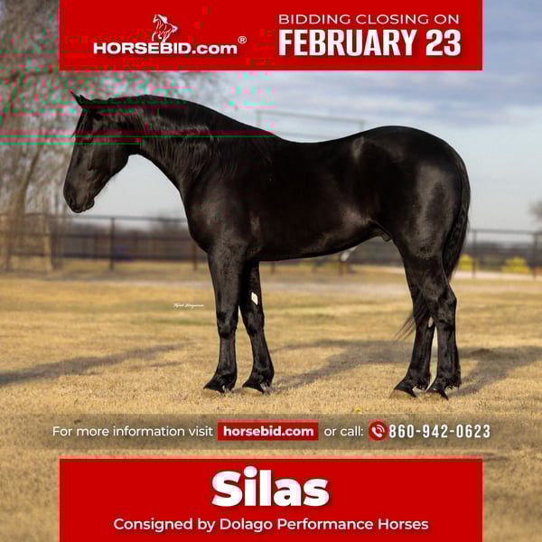 💎 𝐓𝐇𝐄 𝓓𝓲𝓪𝓶𝓸𝓷𝓭 𝐒𝐇𝐎𝐖𝐂𝐀𝐒𝐄 💎 Happening now thru MONDAY | FEBRUARY 23rd - Available EXCLUSIVELY on HorseBid's website! For more details and to register visit: www.Horsebid.com CONSIGNOR CONTACT: Dolago Performance Horses 860-942-0623 LOCATION: Ripley, OK BREED: Crossbred REGISTERED: No REGISTERED NAME: Silas COLOR: Jet Black HEIGHT: 16.2 AGE: 4 GENDER: Gelding Silas is truly something special, and anyone who spends time with him will quickly see why! I’m so happy to offer Silas a 4 year old jet black crossbred gelding standing at 16.2 hands and weighs approximately 1400 pounds with the bone, presence, and build to turn heads wherever he goes. He is packed with love and a heart of gold. Don’t let his size scare you with a smooch and a click of a finger he’ll side pass to anything for you to get on… whether it’s a fence, tailgate, water trough, or anything you use! Silas is a horse that not only catches your eye but makes your jaw drop to the floor. He’s one of thoose horses that you could stare at for hours and not get bored. With his deep black coat, matching mane and tail, soft eye, and standout confirmation.. big hip, strong neck, clean legs, and a solid top line. Silas is built to impress. He’s an easy keeper, stays in great shape with minimal effort. He’s not only stunning but he truly has a heart of gold. He is the definition of a puppy dog all he ever wants is loving and pats. He is always wondering what you’re doing and wants to be in your pocket. If he could he would want to do everything with you! Don’t think you’re going to clean his stall without him practically begging for attention. He also LOVES treats and snacks! Now he’s not only just looks and personality he is very fun to ride anywhere! He is very willing to learn and easy to teach anything to! He is one hand broke with a turn around and stop. I have taken many reining lessons with him, rode him english not only in an arena but through town and trail rides, he has been roped off of, used for day work, used on the feed lot, carried the American flag at lots of rodeos, been in many parades, and trail rode more times than I can keep track of! Did I mention he dosnt bat an eye at fire. He is my go to ride for anything! I always say if I were to ride a horse through battle it would be him! You can saddle him english or western and take him anywhere or do anything without a bat of an eye! I sure have had a blast owning him and getting to work with him it’s now somebody else’s turn to enjoy this phenomenal horse!