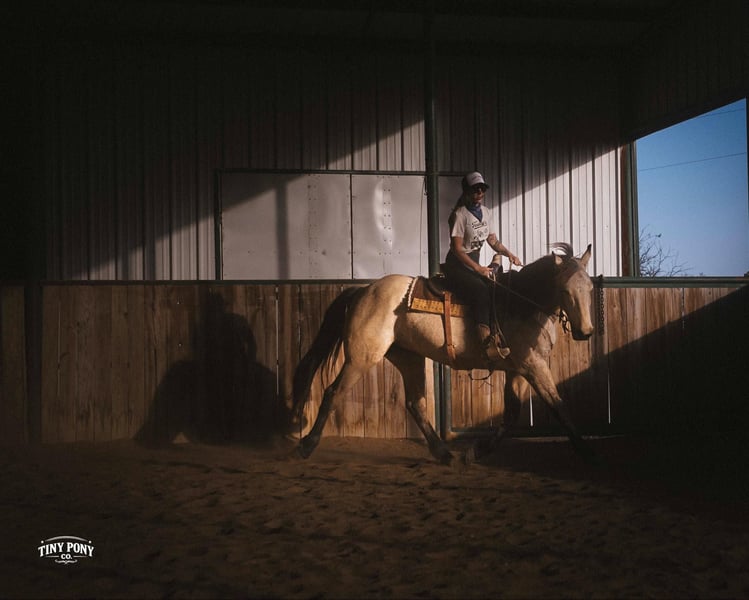 "AVAILABLE ON ONLINE HORSE AUCTION AT www DOT PlatinumEquineAuction DOT com BIDDING OPEN NOW thru SUNDAY | MARCH 29TH! *Final price will be determined on auction site* CONSIGNOR CONTACT INFO: Tiny Pony Co. 406-250-9530 LOCATION: Jacksboro, TX Story was born confident and brave. This honest gelding has one of those minds that you only find once in a blue moon. He is cool, calm and collected and will do anything you ask of him. He is gentle on the ground and in the saddle. Not only is he intelligent, he is gorgeous - who doesn’t want a 4 year old 16.2h Buckskin Percheron x QH that is so versatile, he can do any job you want him to? We have had the pleasure of watching this gelding mature - he has been a part of our herd since he was two. We have seen him in the high desert, where he was unfazed by loud noise and high winds. We have ridden him out solo in the hills of Montana and he never hesitated - he does not need a buddy to brave new territory. He is notably surefooted, level-headed and steady. He has never made a misstep or offered us any silly behavior. He stands still to mount and is very easy to catch - he would never leave you stranded in the backcountry. Story shows genuine excitement when learning new things and you can always feel the lightbulb go off when he gets it - and he remembers what you’ve taught him the next time you ask for it. His talent and athleticism make him a truly enjoyable horse to ride. He is broke to ride English and Western and is very light in the bridle without being touchy. He knows how to lope off with a kiss, open and close gates, and jumps with ease. (see his very first day of jump training in his video!) While he is happy to move out when asked, the draft horse side of him still prefers a nice, leisurely walking pace. Take him and finish him out - he would make a trusted trail partner, handy ranch horse, or excellent fox hunting prospect. Story is quiet and easy in a stall or run, but is also comfortable living out in a herd - he is generally near the top of the pecking order, but is not rude about it. He loads and unloads with ease and stands peacefully for the farrier. He is an easy keeper, currently on a forage only diet. He is sound, requires no maintenance and has freshly floated teeth. He does have a tiny, healed corneal scar (right eye) that is purely cosmetic and does not affect his vision or performance in any way - cleared by a veterinary ophthalmologist in 2025 (happy to provide documentation to any prospective buyers). PPE welcome at buyer’s expense. Located in Jacksboro, TX. Text or call Courtney Maddux @ 406.250.9530 for with your questions! Tiny Pony Co. riders are 5’6 and 6’5 for reference.