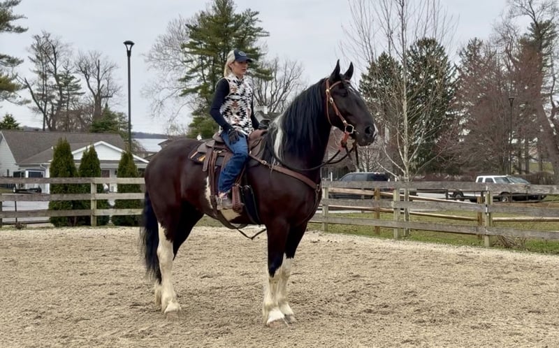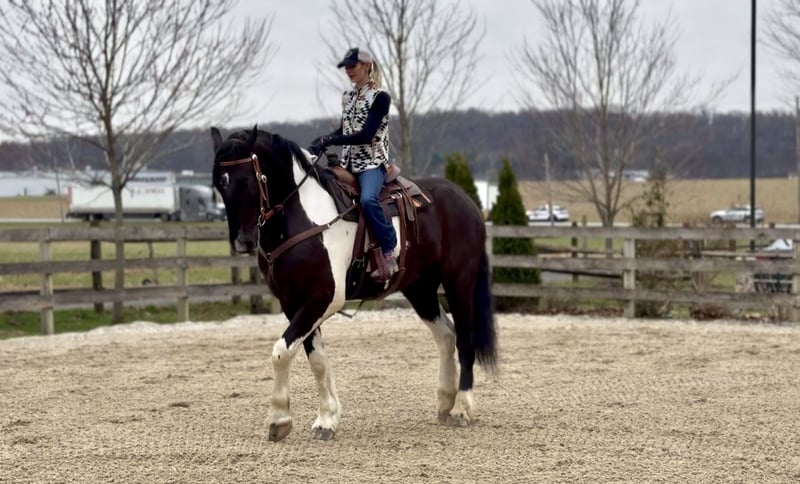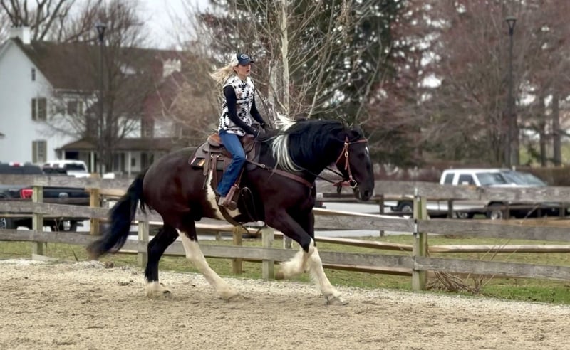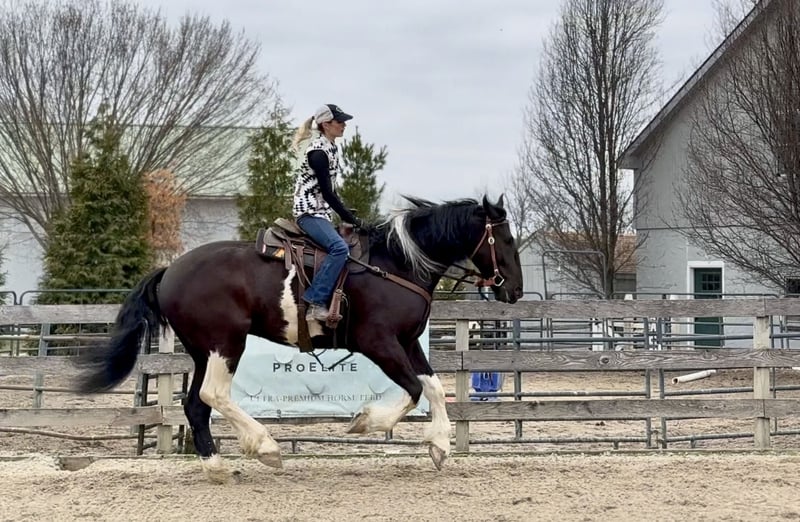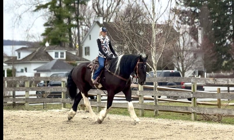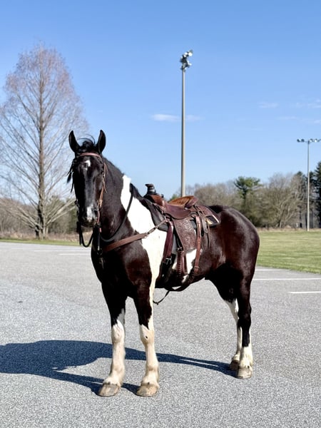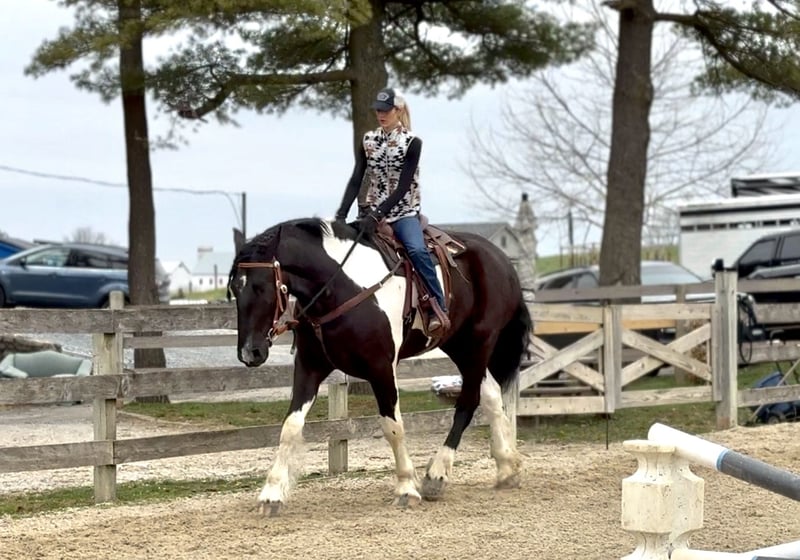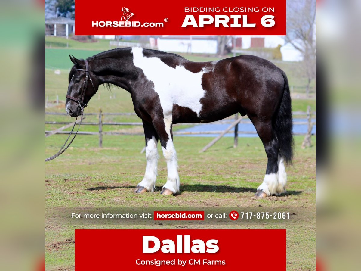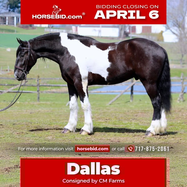 🌟𝑨𝒑𝒓𝒊𝒍 𝐀𝐋𝐋 𝐒𝐓𝐀𝐑 𝐋𝐈𝐍𝐄𝐔𝐏🌟 Happening now thru MONDAY | APRIL 6th - Available EXCLUSIVELY on HorseBid's website! For more details and to register visit: www.Horsebid.com CONSIGNOR CONTACT: CM Farms 717-875-2061 LOCATION: Gap, PA BREED: Spotted Draft/Friesianx REGISTERED: No COLOR: B/W paint HEIGHT: 17.2 AGE: 4 GENDER: Gelding Meet ✨ Dallas ✨ This jaw-dropping gelding is a 4-year-old Friesian/Spotted Draft cross standing an impressive 17.2 hands high. Dallas is the kind that instantly grabs your attention—the kind people stop scrolling for. His bold black and white paint coloring, combined with his big, powerful build, uphill frame, strong neck, and pretty, refined head, make him as eye-catching as they come. Horses built and colored like this are few and far between, and it’s what sets him apart from the rest. But Dallas isn’t just a pretty face—he backs it up with an exceptional mind to match. He is safe, sane, smart, kind, and truly suitable for just about anyone. 💫 Under saddle, Dallas is just as exceptional as he is beautiful. He has smooth, comfortable gaits that make him a pleasure to ride all day long. His walk is relaxed and steady, his trot is easy to sit, and his canter is soft, balanced, and simple to ride. What really sets him apart is how he feels—despite his big frame, he rides light, soft, and almost floaty, not heavy like you might expect. He is naturally balanced and carries himself with ease, making him incredibly user-friendly and enjoyable for riders of all levels. He’s the same dependable horse every time you swing a leg over him—level-headed, forgiving, and always willing. Dallas has been ridden both inside the arena and out, and he handles new environments with confidence and ease. 🔥 He has also been lightly started over fences and is proving to be a natural. Given his size and age, we’ve taken our time with him, but he shows all the right qualities—cute knees, natural scope, and a willing, quiet mind. He stays relaxed and confident, making him a very fun and promising prospect for someone looking to take him further. Out on the trail, Dallas is truly in a league of his own—the kind everyone is searching for but rarely finds. You can drop the reins and simply enjoy the ride; he’ll take care of the rest like an old, seasoned horse with years of experience. He will go absolutely anywhere you point him without hesitation—no forcing, no second-guessing, just a willing partner every step of the way. He’s not too fast and not too slow—just that perfect, steady pace that makes for a fun, relaxing ride every time. And if there’s water involved, even better—Dallas absolutely loves it. Lakes, rivers, streams… if he spots a puddle, he’ll happily make his way over just to splash through it. What horse does that?! 🌊 In the barn, Dallas’s personality is just as special as his ride. He’s got a goofy, lovable nature and genuinely wants to be your buddy. He’s the type that will be right in your pocket every chance he gets—more like a puppy dog than a horse. He loves attention, enjoys being around people, and makes every interaction enjoyable. He’ll meet you at the gate, stand quietly for grooming and tacking, and is an easy, pleasant horse to have around every day. Horses like Dallas don’t come around often—he’s got the size, the looks, the brain, and the kind of personality that people spend years searching for. It’s rare to find one this big that rides this light, thinks this well, and takes care of his rider the way he does. Whether you want to trail ride, enjoy the arena, or continue bringing him along over fences, he fits the bill in every way. He’s the kind you’ll look forward to riding every single day—and the kind you won’t replace once he’s gone. We know whoever ends up with Dallas is getting something truly special. 💛 UTD on Shots, Coggins, Farrier, Dentist and Deworming.