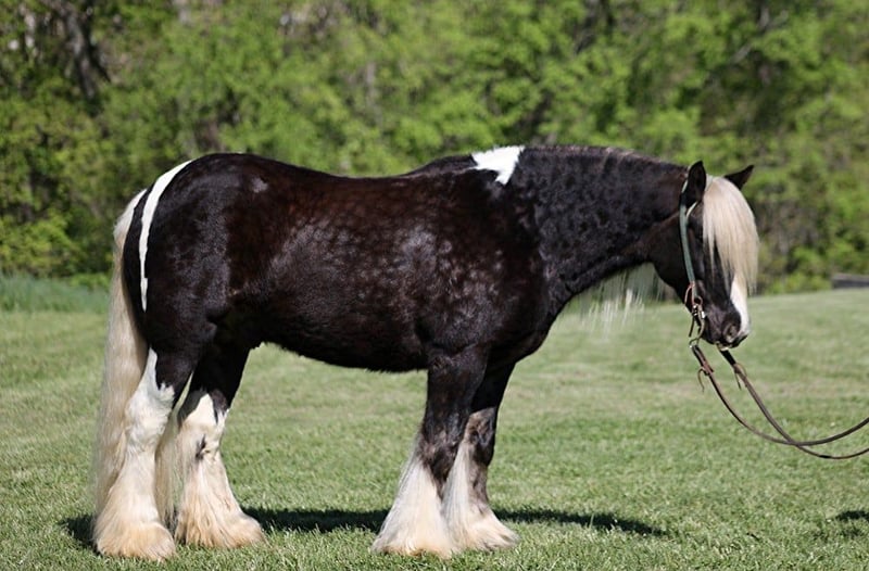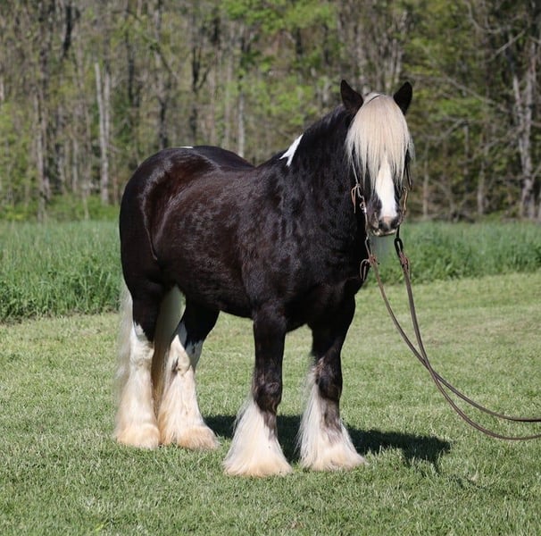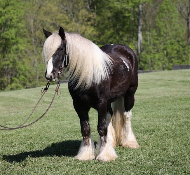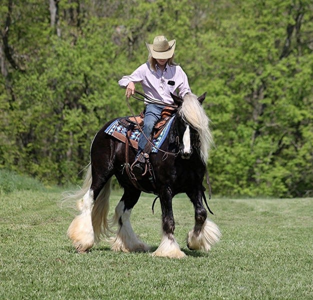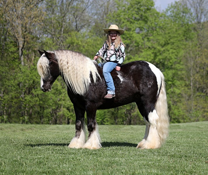 Consigned to Cowgirl Cadillacs in Sheridan, WY. Sales June 14-15th. You can bid online, phone bid or bid in person! Sweet dreams are made of this!!! CROSS CREEK SUGARFOOT could not have a more fitting name than “Sugar”! He is the sweetest horse with the most inquisitive personality and he has NEVER met a stranger! He loves for the kids to take him to the “beauty shop”; bath time, getting his hair done and being all sparkled up are his favorite things! This horse is without a doubt a real life “Barbie” horse. Sugar is a well built 14.2hh, 4 year old, rare silver dapple tobiano, registered Gypsy Vanner gelding! People love these gypsies for their versatility and calm nature and Sugar is a true testament to the breed! He has been ridden around the ranch, pushed cows, pasture roped and doctored. He has been ridden by kids down the highways, through town and is safe around all traffic. He loves to hit the trails and just cruise along slow and easy! He will cross creeks, ditches, logs and navigate rough rocky areas while taking care of the most precious of cargo(rider)! Sugar has been exposed to all kinds of wildlife and will go anywhere that he is asked too. He has a smooth jog, a nice lope, he reins around and turns a circle both ways, sides passes and backs with ease! Sugar has some tricks “up his feathers” and will lay down for mounting/dismounting. Sugar has been ridden by all ages of kids from 4 on up and can suit any rider’s ability level. If you have big dreams of that special riding partner and best friend, sweet dreams do come true… just add Sugar! Call 606-308-2461 for more info.