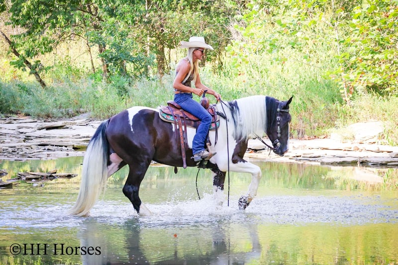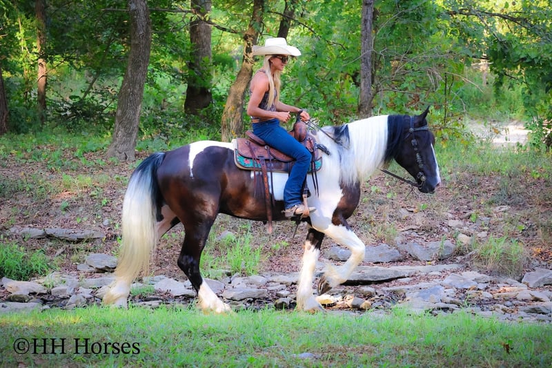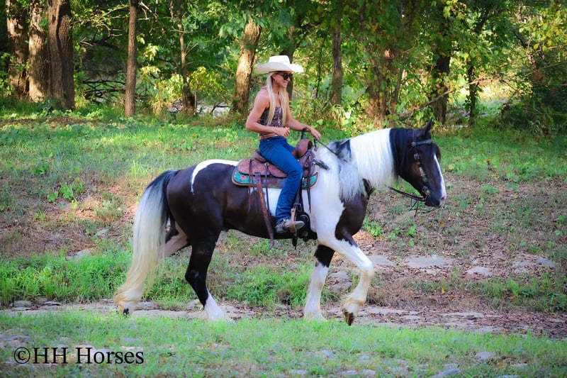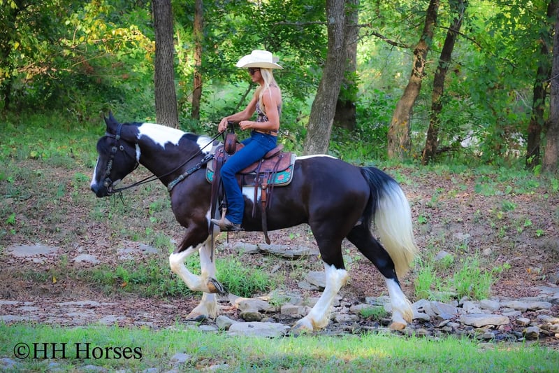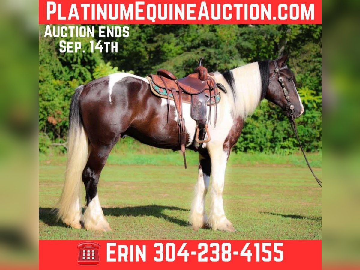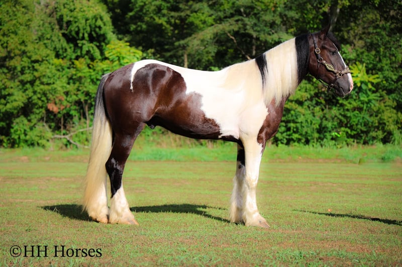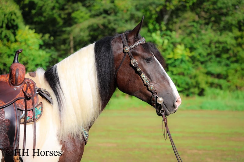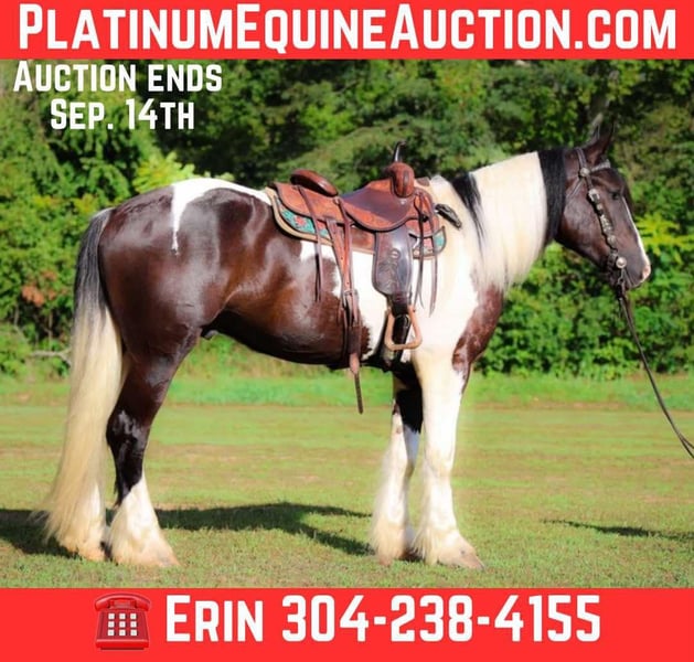 ONLINE AUCTION Place your bids at www.PlatinumEquineAuction.com Starting Bid $3500 Auction ends September 14th, 2025 Need a new saddle? Check out White Rock Saddles on our website or Facebook This is “BIG N’ RICH”, a very stout, extra flashy, super fancy moving, GYPSY VANNER SPOTTED DRAFT CROSSBRED gelding that is broke to ride and drive. He stands 16 hands tall and is 4 years old. He is broke to work double or single and has pulled hay wagons, pumpkin patch wagons, and been hooked to all farm machinery. He has pulled a cart and carriage through holiday parades. He has been in heavy traffic and lots of commotion with no issues. He is a superb trail mount that will go anywhere you point him, willingly and steadily. He is sure footed through very rocky and steep terrain and he takes his time down rough embankments and up and down the rugged trails. He is a love bug on the ground and will soak up all the attention you will give him. He lopes nice circles, catches his leads, stops easily, and backs up. He has been shown in lead line with novice riders. He has excellent ground manners, stands tied, loads, bathes, and hauls with no fuss. Located in Flemingsburg, KY. Contact Erin with HH Horses 304-238-4155 with any questions or to make a Buy It Now Offer. ONLINE AUCTION Place your bids at www.PlatinumEquineAuction.com Starting Bid $3500 Auction ends September 14th, 2025 Need a new saddle? Check out White Rock Saddles on our website or Facebook