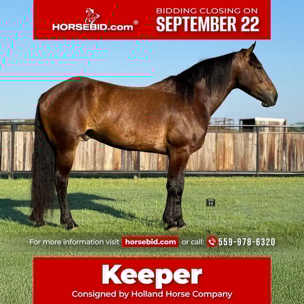 🍁𝒕𝒉𝒆 𝐅𝐀𝐋𝐋 𝑺𝒑𝒆𝒄𝒕𝒂𝒄𝒖𝒍𝒂𝒓🍁 Happening now thru MONDAY | SEPTEMBER 22nd - Available EXCLUSIVELY on HorseBid's website! For more details and to register visit: www.Horsebid.com CONSIGNOR CONTACT: Holland Horse Company 559-978-6320 LOCATION: Jacksboro, TX BREED: Draft Cross REGISTERED: No REGISTERED NAME: Keeper COLOR: Bay HEIGHT: 16.1 AGE: 4 GENDER: Gelding Keeper is a classy draft cross gelding standing 16.1 hands with the perfect blend of bone and athleticism. He is as kind and as gentle as they come with a very laid back demeanor. Keeper is a beautiful mover under both English and Western tack. He is also broke to drive both single and double and can work all farm equipment. Traffic safe. In the arena Keeper has a beautiful head set, smooth and easy transitions and nice circles. Out on the trails Keeper is as safe and solid as they get and will go anywhere asked of him. He is safe and simple enough for absolutely anyone to ride and enjoy. Keeper loves to play soccer and knows how to kick the ball. He gets along great out in the pasture with everything. He has perfect ground manners and is excellent for the shoer. Keeper is a true gentleman that we promise you will love when you get him home! Sound. FMI call/text Chanel with Holland Horse Company 559-978-6320. We are happy to answer any questions, schedule a test ride and help arrange shipping nationwide!