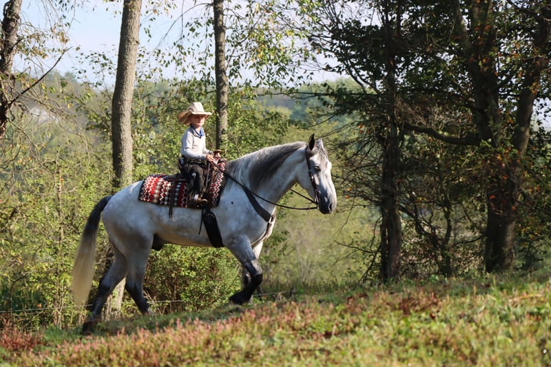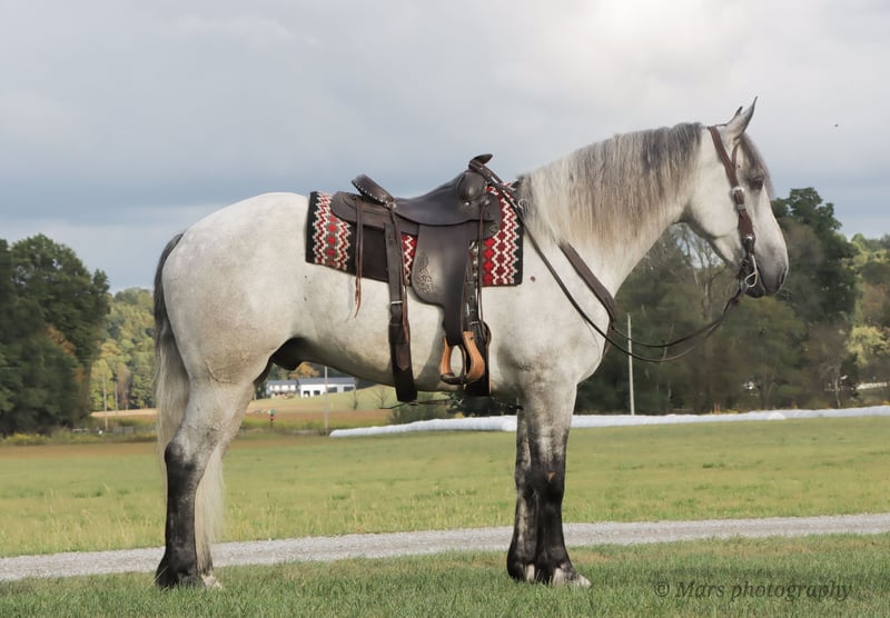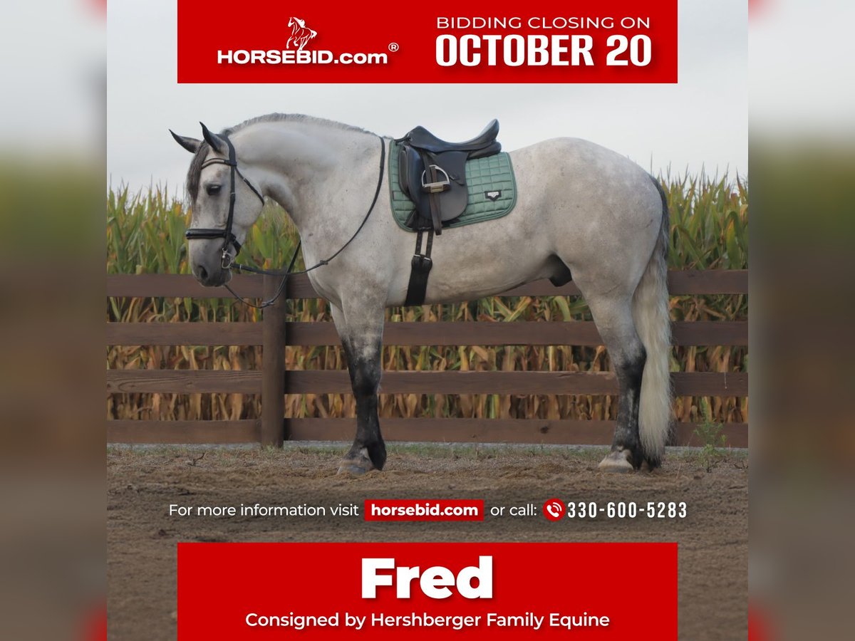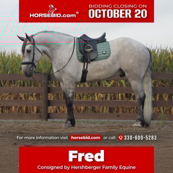 ♦️ 𝐭𝐡𝐞 𝐀𝐌𝐄𝐑𝐈𝐂𝐀𝐍 𝓕𝓪𝓵𝓵 𝓒𝓵𝓪𝓼𝓼𝓲𝓬 ♦️ Happening now thru MONDAY | OCTOBER 20th - Available EXCLUSIVELY on HorseBid's website! For more details and to register visit: www.Horsebid.com CONSIGNOR CONTACT: Hershberger Family Equine 330-600-5283 LOCATION: Sugarcreek, OH BREED: Draft cross REGISTERED: No COLOR: Grey HEIGHT: 16 AGE: 5 GENDER: Gelding Fred is a gorgeous very athletic 5yr old 16 hand draft cross gelding. We have had him since he was a 2yr old. Fred is well trained to ride English or western. He has been on numerous trail rides and overnight camping trips, goes through water, across logs, up-down hills and stands at a highline without a problem. Fred walks, trots and canters circles, straight lines or on the road. He does well with tarps, bull whips, traffic and much more. He also knows how to lay down on command and can be ridden by kids of all ages. If you are wanting to schedule a visit or have more questions contact Jamie.