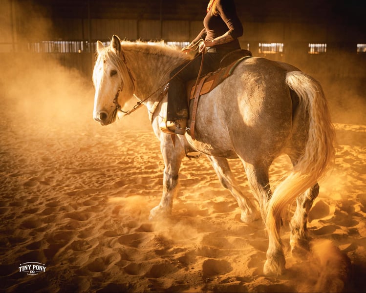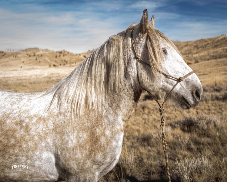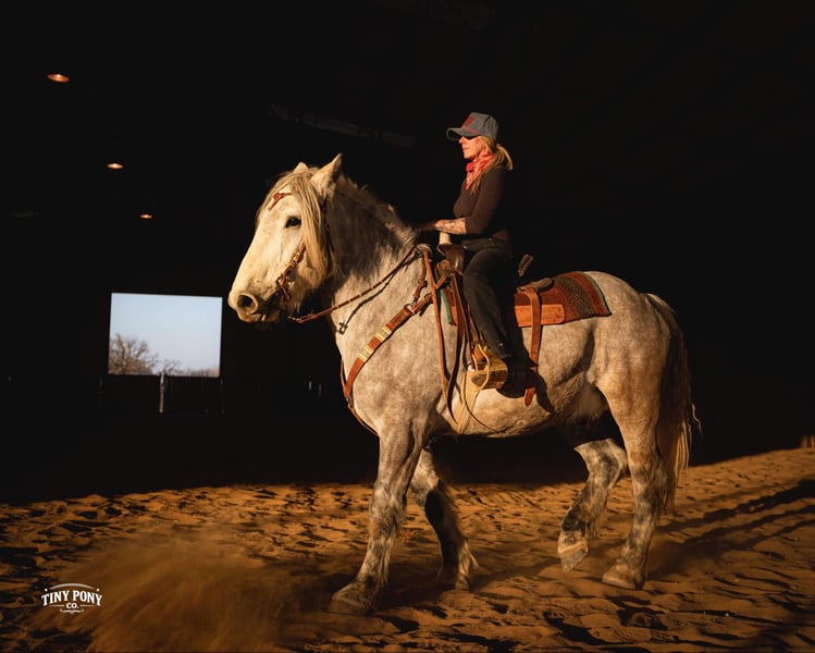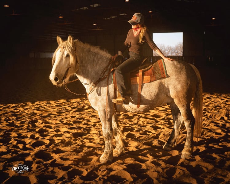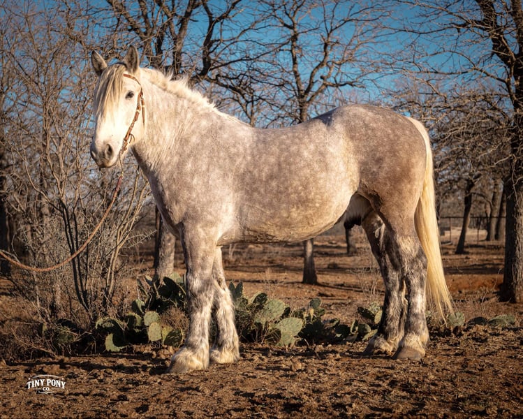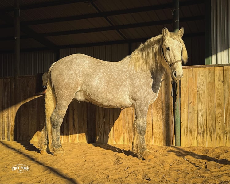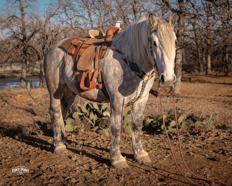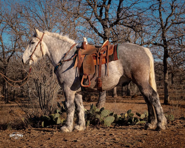 "AVAILABLE ON ONLINE HORSE AUCTION AT www DOT PlatinumEquineAuction DOT com BIDDING OPEN NOW thru SUNDAY | MARCH 1ST! *Final price will be determined on auction site* CONSIGNOR CONTACT INFO: Tiny Pony Co. 406-250-9530 LOCATION: Jacksboro, TX Tiny Pony Co. proudly offers Torgard. This gelding is a stunning and unique rose grey dapple, Old-World built Percheron. He is 6 years old and stands an impressive 16.2h. Torgard lives up to his name, which means “protected by thunder”. He has the presence of a war horse with the heart of a best friend. He has been a part of our program (and our family), since early last summer - we have grown to know him well and love him immensely. He has proven to be a calm, confident and kind horse. He thrives on deep connection, we calll him a “people horse” - he prefers to spend time in community with his humans. Torgard has more personality than a lot of folks we know. He is pure entertainment, very cheeky and playful - he will steal the gloves from your pocket, the hat off your head or the flag during training (see video!) His playfulness is nicely balanced with soft, snuggly moments - making him that much more lovable. On the ground, Torgard has learned to be respectful of his leaders personal space. He will stand tied (often napping) all day. He also ground ties nicely. He loves attention - lengthy grooming sessions and long chats take him right to his happy place. Torgard thoroughly enjoys working at liberty and is content to just hang out with his people - no lead rope required. In the saddle, Torgard feels gentle yet confident - as though he understands the importance of protecting his rider. He walks with purpose and pride. His gaits are very smooth for a gelding of his size and he is soft in the ribcage, moving around nicely for a horse of his stature. He is a comfortable ride, picks up the correct leads, side passes, half passes and stops nicely off the seat and “woah”. He isn’t heavy in the bridle and moves well off of leg pressure. He has the strength and stamina to easily carry any rider on an all day adventure. He is the same horse every day you pull him out to work - he puts his head right in the halter, ready to spend time with you - any way you’d like. Take this one anywhere and any which way you want - we believe he was born to hit the trails and that he would excel as a backcountry hunting mount, pack horse or even a mounted patrol horse. He is brave, sure footed, patiently stands rein on mane and loves being out in nature. He will also stand calmly to be mounted from the ground, a rock, a log and yes, even the scary mounting block! He is both willing and a quick study. Torgard can be kept out in a herd or in a stall with no trouble. He has proven to be middle to low end of the pecking order out on pasture. He loads and unloads from the trailer with ease. As much patience as this sweet horse has, when it comes to getting a trim from the farrier, he requires a little help and understanding. He is never rude, but struggles sometimes to find his balance - however, he has shown great progress in this area! This guy is an easy keeper that requires no maintenance and is currently on a forage only diet. He sells sound, UTD on vaccines and has freshly floated teeth. PPE welcome at buyer’s expense. Located in Jacksboro, TX. Text or call Courtney Maddux @ 406.250.9530 for more information or with questions! Tiny Pony Co. riders are 5’6 and 6’5 for reference.