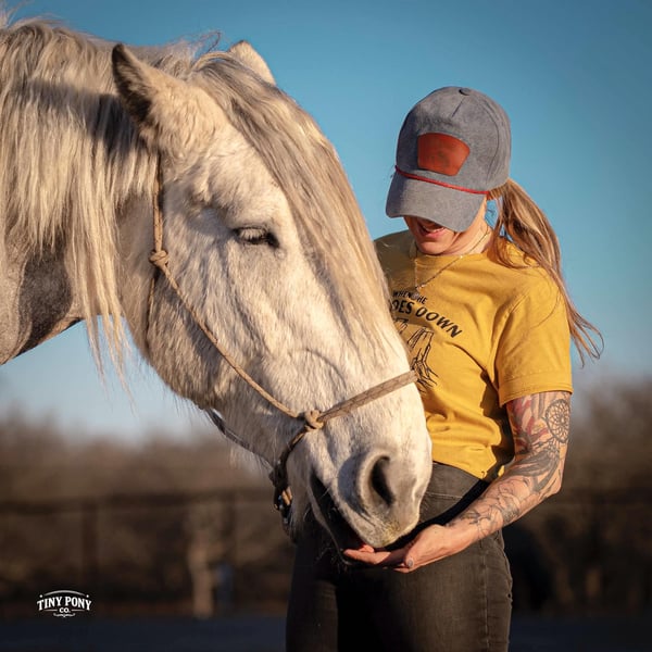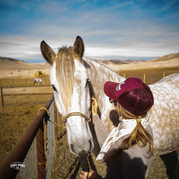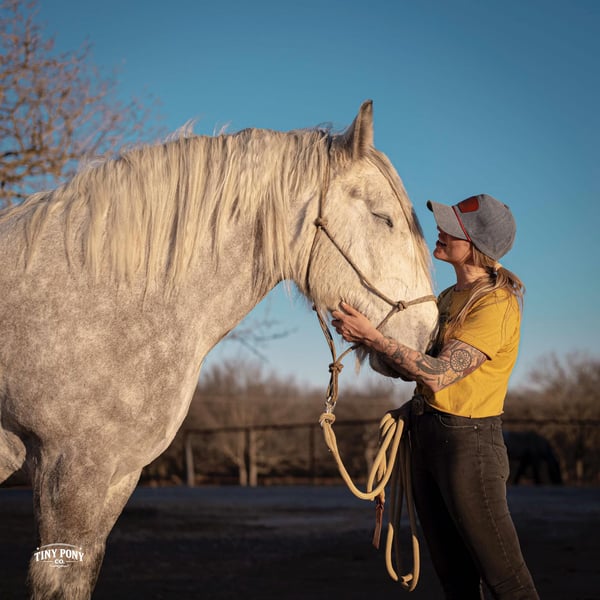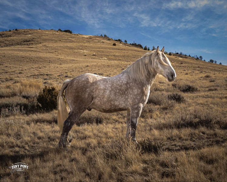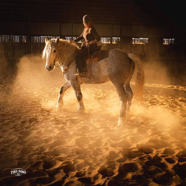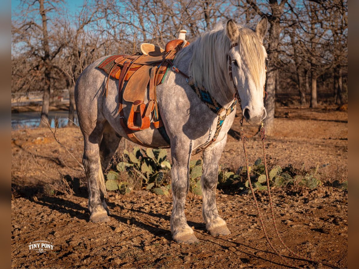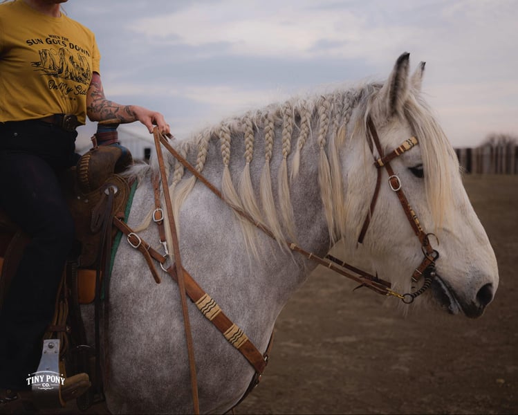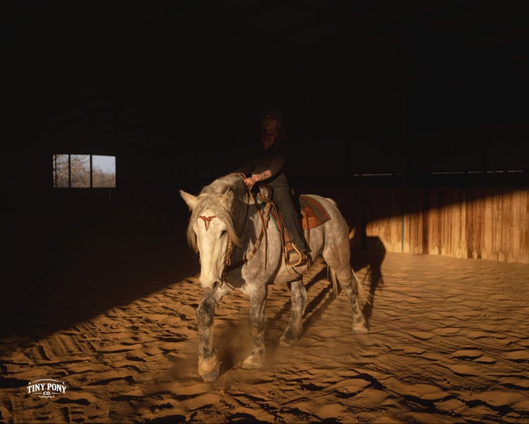 "AVAILABLE ON ONLINE HORSE AUCTION AT www DOT PlatinumEquineAuction DOT com BIDDING OPEN NOW thru SUNDAY | MARCH 1ST! *Final price will be determined on auction site* CONSIGNOR CONTACT INFO: Tiny Pony Co. 406-250-9530 LOCATION: Jacksboro, TX Tiny Pony Co. proudly offers Torgard. This gelding is a stunning and unique rose grey dapple, Old-World built Percheron. He is 6 years old and stands an impressive 16.2h. Torgard lives up to his name, which means “protected by thunder”. He has the presence of a war horse with the heart of a best friend. He has been a part of our program (and our family), since early last summer - we have grown to know him well and love him immensely. He has proven to be a calm, confident and kind horse. He thrives on deep connection, we calll him a “people horse” - he prefers to spend time in community with his humans. Torgard has more personality than a lot of folks we know. He is pure entertainment, very cheeky and playful - he will steal the gloves from your pocket, the hat off your head or the flag during training (see video!) His playfulness is nicely balanced with soft, snuggly moments - making him that much more lovable. On the ground, Torgard has learned to be respectful of his leaders personal space. He will stand tied (often napping) all day. He also ground ties nicely. He loves attention - lengthy grooming sessions and long chats take him right to his happy place. Torgard thoroughly enjoys working at liberty and is content to just hang out with his people - no lead rope required. In the saddle, Torgard feels gentle yet confident - as though he understands the importance of protecting his rider. He walks with purpose and pride. His gaits are very smooth for a gelding of his size and he is soft in the ribcage, moving around nicely for a horse of his stature. He is a comfortable ride, picks up the correct leads, side passes, half passes and stops nicely off the seat and “woah”. He isn’t heavy in the bridle and moves well off of leg pressure. He has the strength and stamina to easily carry any rider on an all day adventure. He is the same horse every day you pull him out to work - he puts his head right in the halter, ready to spend time with you - any way you’d like. Take this one anywhere and any which way you want - we believe he was born to hit the trails and that he would excel as a backcountry hunting mount, pack horse or even a mounted patrol horse. He is brave, sure footed, patiently stands rein on mane and loves being out in nature. He will also stand calmly to be mounted from the ground, a rock, a log and yes, even the scary mounting block! He is both willing and a quick study. Torgard can be kept out in a herd or in a stall with no trouble. He has proven to be middle to low end of the pecking order out on pasture. He loads and unloads from the trailer with ease. As much patience as this sweet horse has, when it comes to getting a trim from the farrier, he requires a little help and understanding. He is never rude, but struggles sometimes to find his balance - however, he has shown great progress in this area! This guy is an easy keeper that requires no maintenance and is currently on a forage only diet. He sells sound, UTD on vaccines and has freshly floated teeth. PPE welcome at buyer’s expense. Located in Jacksboro, TX. Text or call Courtney Maddux @ 406.250.9530 for more information or with questions! Tiny Pony Co. riders are 5’6 and 6’5 for reference.