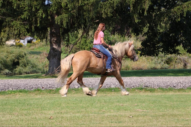 ONLINE AUCTION Place your bids at www.PlatinumEquineAuction.com Starting Bid $3500 Auction ends September 29th, 2024 Need a new saddle? Check out White Rock Saddles on our website or Facebook! Blackstones Golden Boy, or Sargent as we call him around the farm is the kind of horse that turns heads wherever he goes. This stunning 4-year-old, 16.2hh champagne colored American Cream Gypsy Vanner cross gelding is not just a remarkable sight. He shines like pure gold in the sun and has a gorgeous blonde mane and tail. he is a powerhouse of strength, versatility, and athleticism. For a horse of his size, Sargent moves with incredible grace and fluidity, making him not only a reliable mount but also an athlete in his own right. Whether you are riding Western, English, or bareback, Sargent delivers an exceptional experience, seamlessly transitioning between disciplines with ease. What truly makes Sargent stand out is his “been there, done that” attitude. He is the definition of a bombproof horse—absolutely safe in any environment. Sargent has been ridden on state roads, in the woods, open fields, and has even gone on a shopping trip to our local farm store! His beautiful golden color blonde mane and tail and flowing feathers capture everyone’s attention! One glance into his big hazel eyes will steal your heart. Out on the trails, Sargents calm, and steady nature shines. Water crossings, tarps, bridges and other common obstacles do not phase him in the slightest. His even temperament makes him an ideal horse for beginners who need a forgiving partner, while his experience and smooth gaits make him just as enjoyable for advanced riders. Sargent is the rare horse that adapts to his rider’s needs, making him a perfect fit for anyone from novice to seasoned equestrians. And speaking of smoothness, Sargents three gaits are simply unbeatable. His walk, trot, and canter are incredibly fluid and comfortable, making him perfect for all-day rides without leaving you sore. Whether you are working in the arena or exploring the trails, Sargents athleticism and stamina ensure he will keep going strong, mile after mile. In short, Sargent is the full package: strikingly beautiful, strong, athletic, and most importantly, safe. If you are looking for a versatile horse that excels in both riding and driving, Sargent is the perfect partner. He is ready to take on anything, whether you are a beginner looking for safety or an experienced rider seeking a smooth, dependable horse for long adventures. Sargent lives in Howell, MI 48855. Please call or text Ellesse Schwartz at 248-390-6831 for more information. ONLINE AUCTION Place your bids at www.PlatinumEquineAuction.com Starting Bid $3500 Auction ends September 29th, 2024 Need a new saddle? Check out White Rock Saddles on our website or Facebook!