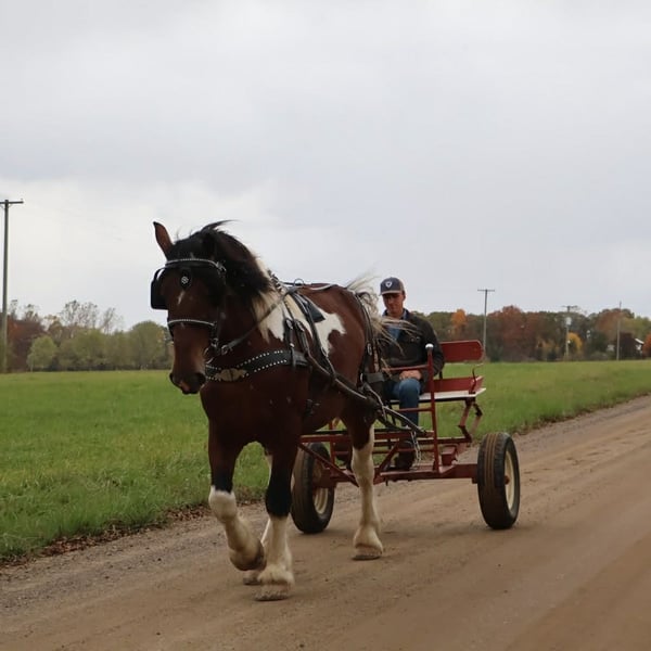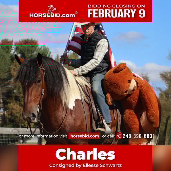 ❤️🔥𝑩𝒆 𝑴𝒊𝒏𝒆 𝐒𝐄𝐋𝐄𝐂𝐓❤️🔥 Happening now thru MONDAY | FEBRUARY 9th - Available EXCLUSIVELY on HorseBid's website! For more details and to register visit: www.Horsebid.com CONSIGNOR CONTACT: Ellesse Schwartz 248-390-6831 LOCATION: Howell, MI BREED: Spotted Draft REGISTERED: No REGISTERED NAME: Charles COLOR: Tri Colored paint HEIGHT: 17 AGE: 6 GENDER: Gelding Would you be mine? We would love to introduce Blackstones Charles. This 6 year old 17hh spotted draft gelding has it all. From his captivating personality to his stunning conformation and painted color. Charles lacks nothing. Charles is the type of horse who wants to be your best friend. He plays well with all the others outside and will catch you when you walk to the pasture. Charles is extremely well broke. He walk, trots, canters and stops on a dime. His transitions are flawless both upward and down. Charles steers off seat and leg so well you don’t even need a bridle. He will gladly take a bit, snaffle or shank he’s not fussy or just pull the bridle right off and he steers with all leg ques. He builds you up every ride and makes you want to get on. Charles has loads of experience out on the trails from the mountains of MO to the open fields of MI he’s seen it. Water, deep woods, roads, wildlife no problem. Charles has been ridden in groups of 40 horses. He will take any place you ask in the group and is not one to get worked up. He’s also been out alone. He’s been driven single and double. He has worked in busy city's, in traffic and crowds of people. He stands to harness. He stands at stop signs and he will stand for passengers to get on and off the carriage. He has a great amount of training in the arena as well. He will easily steep into the lope, and can canter small circles on both leads. Charles is very balanced and light on his feet. He’s completed our desensitizing program. Pool noodles, tarps and bridges are all no problem for him. He is a very brave horse. Charles is the horse to teach you the ropes, the one you can depend on and he’s loaded with personality. He is sure to win you over with one glance into his big soft eyes! Charles lives in Howell, MI. Please call or text Ellesse Schwartz at 248-390-6831