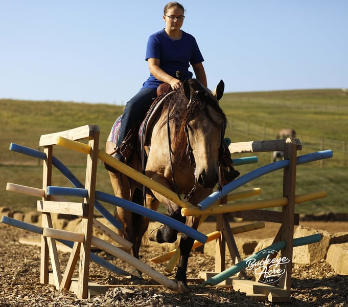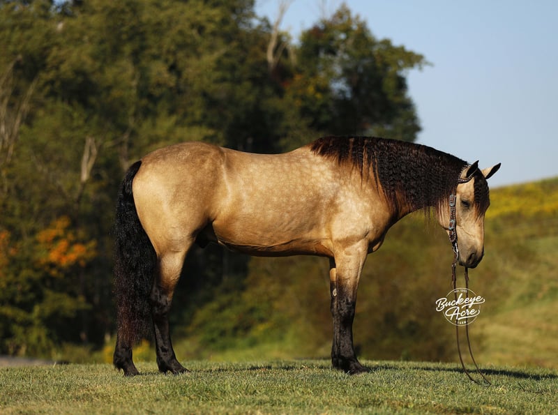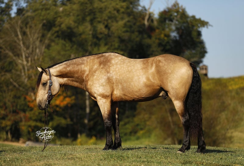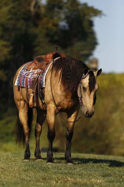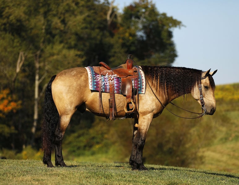 Wow – what a beautiful gelding! Sage is a 2019 model buckskin Draft cross standing 15.3 hands tall, with the kind of good looks and presence that turn heads everywhere he goes. Sage has been ridden for miles on trails and knows his way around the ranch life—he has checked fence lines, moved cows, and pitched in with ranch chores. Out on the trails, he is solid and steady, taking hills, water crossings, creeks, and logs all in stride with confidence and ease. He has also been ridden in both the indoor and outdoor arena, Western, English, and bareback, giving him a well-rounded foundation. What makes Sage truly special is his temperament. He is safe and dependable for riders of all levels—from beginners and seniors to advanced riders—and is even kid-safe. He has that rare ability to adjust himself to the rider, making him the kind of horse families love to share. Under saddle, Sage is soft in the bridle and responsive to cues. He knows his leads and carries three smooth gaits, including an especially nice uphill canter that you can comfortably ride all day long. Whether you are out for a relaxing ride, tackling trails, working in the arena, or enjoying ranch work, he gives you a comfortable, reliable ride every time. In the barn, Sage has the kind of personality that makes him a joy to be around. He is easy to catch, meets you at the gate, and always shows a willing-to-please attitude. He is the whole package—handsome, kind, versatile, and ready for his next partner. If this sound like the Horse that you have been looking for, please feel free to reach out to Duane @ 330-231-2324 for more information or to Schedule a day to see him in person.