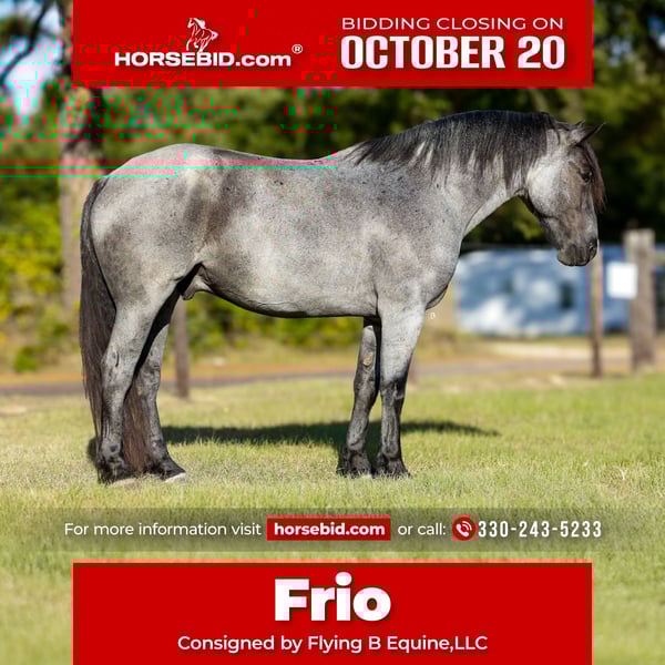 ♦️ 𝐭𝐡𝐞 𝐀𝐌𝐄𝐑𝐈𝐂𝐀𝐍 𝓕𝓪𝓵𝓵 𝓒𝓵𝓪𝓼𝓼𝓲𝓬 ♦️ Happening now thru MONDAY | OCTOBER 20th - Available EXCLUSIVELY on HorseBid's website! For more details and to register visit: www.Horsebid.com CONSIGNOR CONTACT: Flying B Equine,LLC 330-243-5233 LOCATION: Lufkin, TX BREED: Draft Cross - Percheron / Quarter Horse REGISTERED: Yes REGISTERED NAME: FBE Frio N Blue COLOR: Blue Roan HEIGHT: 16.2 AGE: 6 GENDER: Gelding FBE Frio N Blue affectionally known as "Frio" is a 2019 Draft Cross gelding registered with the IDSHR. Standing 16.2HH this boy is BIG, BLUE and BEAUTIFUL! No matter your goals, preferred discipline, or riding atmosphere, Frio has the confidence and athleticism to make your dreams a reality. He has been enjoyed by every level and age of rider and we confidently put a beginner on him! In the arena, he is an elegant mover with a canter that you can sit for hours, and ask for with a simple smooch. His smooth transitions, lead departures and willingness to work strongly support why I believe he would make a great dressage or western dressage prospect. He will pivot on his haunches, stops with ease, and will back up for days. He has been ridden extensively in the arena both under English and Western tack and has also been to a few schooling shows. You can swing a rope, throw balls at him, ride next to machinery or even move cattle on this guy. Frio is the definition of versatile. I’ve personally enjoyed many miles on the back of Frio through the National Forest, where we’ve encountered cyclist, dirt bikes and various wildlife. No matter the obstacle or terrain, Frio will go anywhere you point him without hesitation. He crosses all types of water, bridges, logs, and brush! He is surefooted and his main priority is the safety of his rider. He will stand tied for days to be loved on, groomed, and tacked. He is a complete gentleman for the farrier and the vet. He does not require any maintenance, stocks for shoeing or special feed. He is an easy boy to own, ride, enjoy and fall in love with. He has absolutely no vices! He is UTD on everything, and has a recent PPE on file. He is located with us in Lufkin, Texas and you are welcome to come meet him in person or do your own PPE. We can also help arrange shipping anywhere! Call Bailey @ (330)-243-5233 for more information.