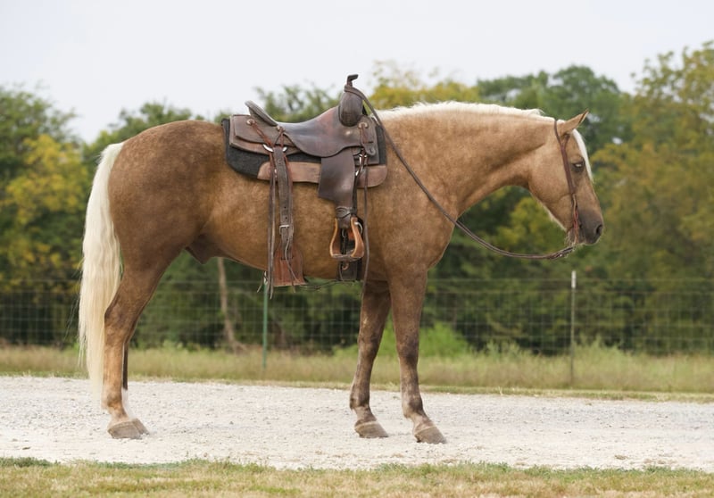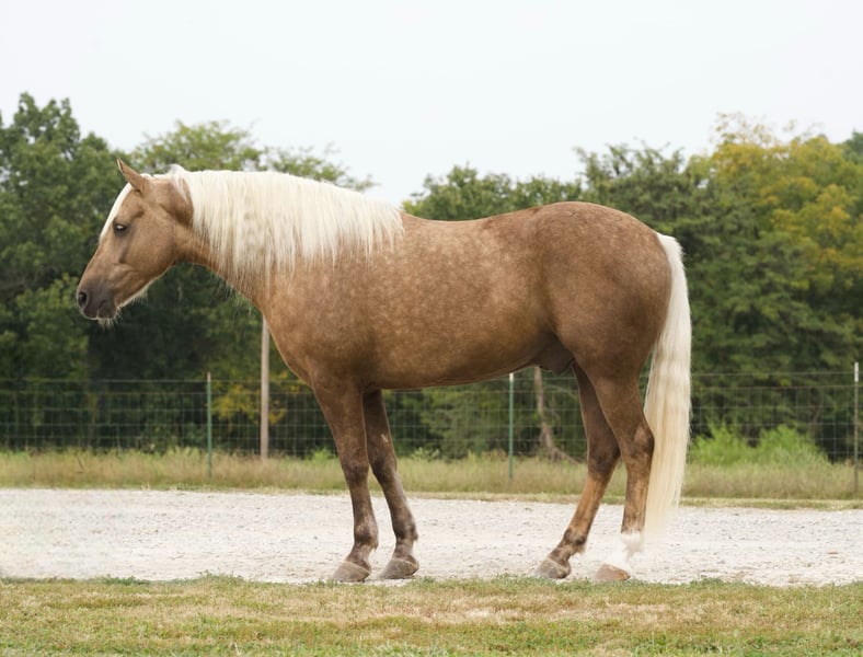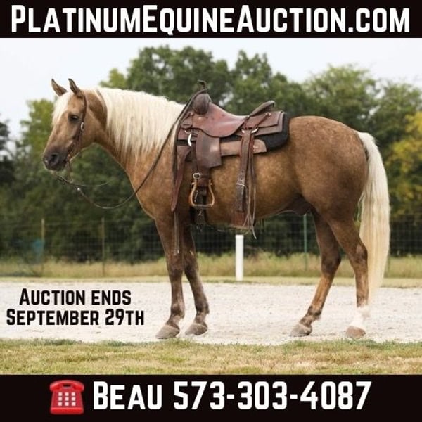 ONLINE AUCTION Place your bids at www.PlatinumEquineAuction.com Starting Bid $3500 Auction ends September 29th, 2024 Need a new saddle? Check out White Rock Saddles on our website or Facebook! Hank is a beautiful 6 year old chocolate palomino draft cross gelding that stands a perfect 15 hands tall and has great conformation. He has been trail ridden absolutely everywhere! He goes anywhere and crosses anything you point him at. He is quiet on the trail and rides out great alone or in a group and doesn’t care if he is in the front middle or back. He is traffic safe and has been around all types of farm animals and wildlife. He has been on many overnight trips and does great! Hank also does great in the arena. He picks up both leads and has a good stop and would make an excellent rodeo pickup/bull shaggin horse if you choose to take him that way He is an honest good minded gelding and does well with time off.He is a blast to ride and loves to please! -no spook -no buck -no bite/kick -Loads/Unloads great -stands good for farrier -stands good for clipping -does great in a stall or out on pasture -does well with other horses -utd on worming and dental work -100% sound -no old injuries or scars Any other questions feel free to give me a call or text anytime Broken S Equine Beau 573-303-4087 Located in Sweet Springs, MO. ONLINE AUCTION Place your bids at www.PlatinumEquineAuction.com Starting Bid $3500 Auction ends September 29th, 2024 Need a new saddle? Check out White Rock Saddles on our website or Facebook!