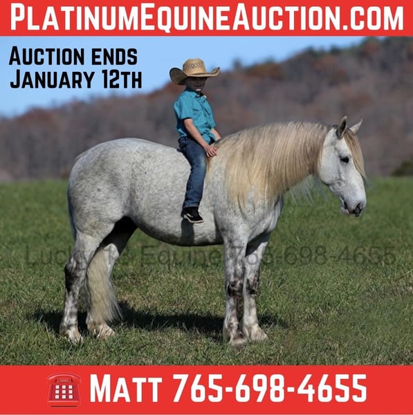 ONLINE AUCTION Place your bids at www.PlatinumEquineAuction.com Starting Bid $3500 Auction ends January 12th, 2024 Need a new saddle? Check out White Rock Saddles on our website or Facebook! Action Jackson is always ready for lifes next adventure! With his contrasting dapple grey coloring, that long flowing mane and tail or his sweet personality… he sparks folk’s attention from all angles! Jackson is a well built 15.2hh, 2018 model, Grey Draftcross Gelding. MAKE SURE TO WATCH HIS VIDEO!!! His name might suggest that he’s just here for adventure and he knows how to go to a job but if a relaxing ride is what you are looking for, then that is exactly what he is wanting to do! Jackson can do anything from slow easy trail rides, pack the medicine bags while pasture roping/doctoring (hundreds of cows/calves as he has), he can push the cows around and hold anything that you tie to the horn. Jackson stands patiently and keeps the rope tight while you work the calf out in the open. If you want to come out of the box, Jackson can turn a steer and has been started on the head side. If you just want to enjoy those long slow miles on the trails with your friends, Jackson is perfectly content to just mosey along slow and easy. He will cross creeks, deadfall, rough rocky areas and scale steep slopes. Jackson is one hand broke, he reins around with ease, has a big stop and lopes very nice circles on the correct lead. Jackson is easy to ride and is safe for all levels whether you use him daily or once a month. Jackson is the type of horse that will keep grandma safe and make her feel like a cowboy all at the same time! Climb on, set back and enjoy all of the action on Jackson! Feel free to call with any questions, to set up a time to come see him or to make a buy it now offer… Lucky 13 Equine Matt 765-698-4655 or Lysandra 765-717-2041. ONLINE AUCTION Place your bids at www.PlatinumEquineAuction.com Starting Bid $3500 Auction ends January 12th, 2024 Need a new saddle? Check out White Rock Saddles on our website or Facebook!