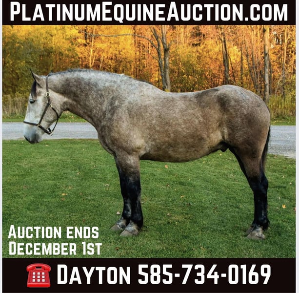 ONLINE AUCTION Place your bids at www.PlatinumEquineAuction.com Starting Bid $3500 Auction ends December 1st, 2024 Need a new saddle? Check out White Rock Saddles on our website or Facebook! Noah is a 6-year-old draft cross gelding standing 17.3 hands. Being a big guy, he walks, trots, and canters with poise. He knows his leads and can canter a nice circle in the arena. He is easy to mount and dismount and stands perfectly still for the mounting block! Noah clips well, easily loads in the trailer, and stands like a gentleman for the vet. His ground manners are excellent; he will stand all day tied with no fuss. He has been exposed to various farm animals and gets along with everyone. Noah will cross logs, bridges, water, and anything else you may encounter on the trail without hesitation. He will trail ride alone or in a group; traffic doesn’t phase him. He will go Western or English. Noah can ride all day on the trail or stand around and be loved. He is a big puppy and loves attention. He is not a bully in the pasture and gets along with mares and geldings. We have put him through our obstacle course, and he does great with all the obstacles. Tarps, bull whips, hills, or pulling objects, nothing bothers him. Under saddle, Noah will side pass and back with ease. He is wearing shoes all the way around due to the rocky conditions around the farm. He easily picks up his feet, but we use a stock to shoe him. Noah sells a 100% sound with No vices! Visit our Facebook page, Wolcott’s Versatility Horses and Training, for more information on our horses. Contact Dayton at 585-734-0169 for more info on Noah! Located in Warsaw, NY. ONLINE AUCTION Place your bids at www.PlatinumEquineAuction.com Starting Bid $3500 Auction ends December 1st, 2024 Need a new saddle? Check out White Rock Saddles on our website or Facebook!
