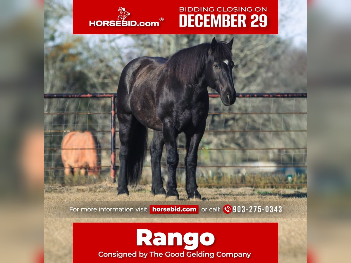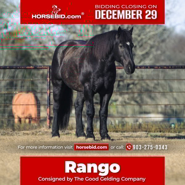 ⚜️𝐓𝐇𝐄 𝓗𝓮𝓻𝓲𝓽𝓪𝓰𝓮 𝐖𝐢𝐧𝐭𝐞𝐫 𝓒𝓵𝓪𝓼𝓼𝓲𝓬⚜️ Happening now thru MONDAY | DECEMBER 29th - Available EXCLUSIVELY on HorseBid's website! For more details and to register visit: www.Horsebid.com CONSIGNOR CONTACT: The Good Gelding Company 903-275-0343 LOCATION: Athens, TX BREED: Draft cross REGISTERED: Yes REGISTERED NAME: GGC Rango COLOR: Blue roan HEIGHT: 15.3 AGE: 8 GENDER: Gelding Rango is a standout blue roan draft cross gelding with exceptional training, presence, and proven real-world experience. Standing 15.3 hands, he offers substance, elegance, and a quiet confidence that is increasingly hard to find. Rango has been successfully used on a mounted police force, giving him an uncommon level of exposure and reliability. He is exceptionally comfortable in traffic, crowds, noise, and high-activity environments, and approaches his work with a calm, unflappable demeanor. This background has produced a gelding that is steady, trustworthy, and mentally mature. Under saddle, Rango is fancy broke and very soft, with an educated feel that appeals to riders who appreciate refinement paired with dependability. He rides both English and western, transitions smoothly between disciplines, and is equally enjoyable in the arena or out on the trail. He is confident in varied terrain, and consistent in his responses. Rango is the type of horse that instills confidence while still offering quality and polish. His combination of training, temperament, and striking blue roan color make him a rare and desirable prospect for riders seeking a seasoned partner with true versatility. He is a high-caliber gelding suitable for discerning riders who value safety, softness, and substance in one exceptional package. Located in Athens, Tx.