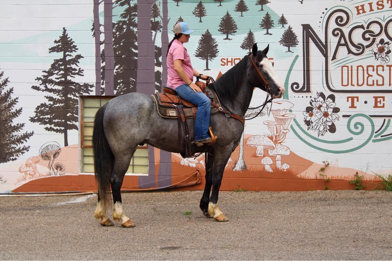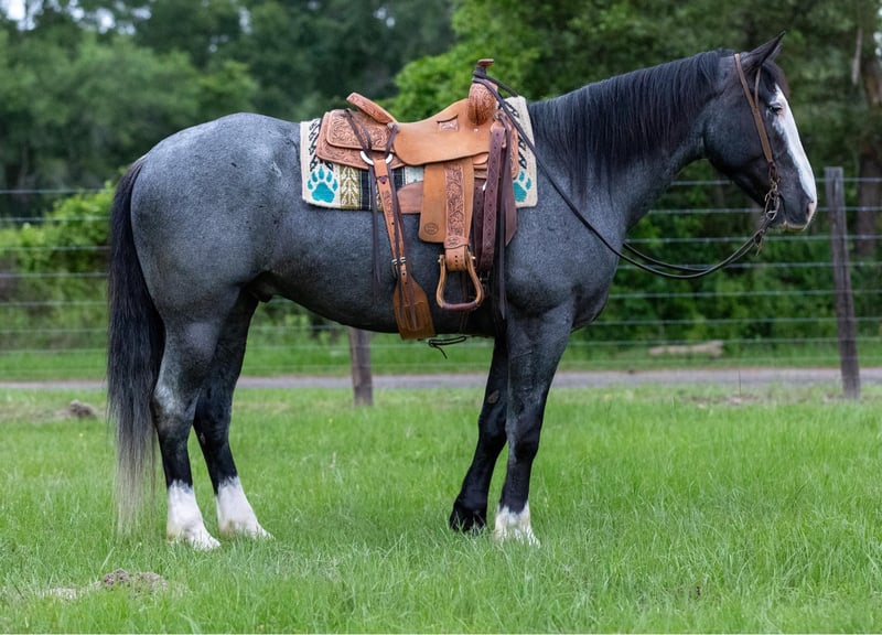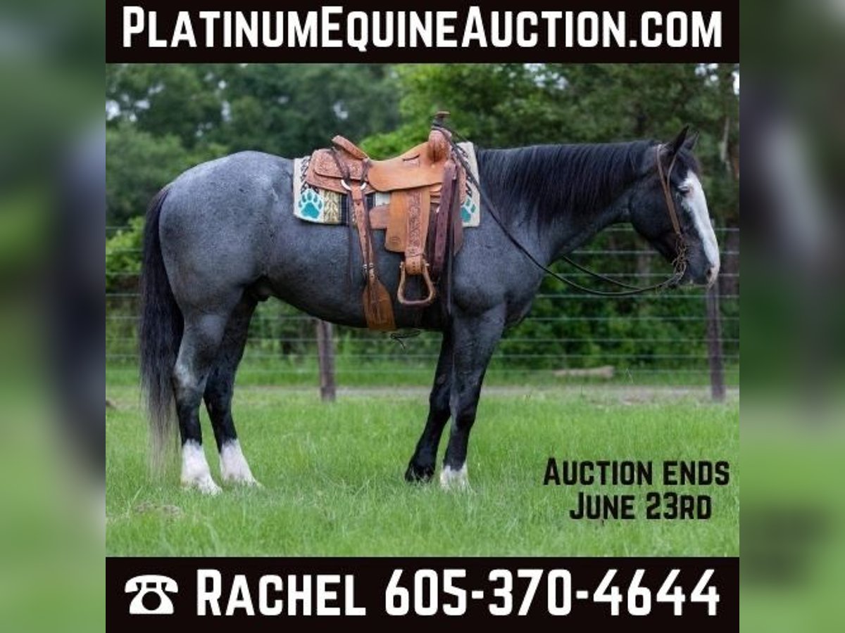 ONLINE AUCTION Place your bids at www.PlatinumEquineAuction.com Starting Bid $3500 Auction ends June 23rd, 2024 Need a new saddle? Check out White Rock Saddles on our website or Facebook! Indigo is a 7 year old BLUE ROAN draftcross gelding, He stands 16.1 hands tall and is a gentle giant! Indigo has been used for a little bit of everything! He has been trail rode all over, been hauled to state parks, he has been hunted off of in the mountains, he has also been packed off of. Indigo does great in any type of terrain, He crosses the creeks, bridges , and logs with no hesitation. Indigo has also spent countless hours on the ranch and in the sale barn doing all aspects of ranch work. He has been used to rope and doctor cattle outside, he has also been used to gather and sort cattle. Indigo has been used at the sale barn for pushing and sorting cattle as well! Indigo is super gentle and quiet, he has a sweet puppy dog personality and wants to be everyones friend! If your looking for a fancy crossbred that you can do anything on be sure to check Indigo out! He is located in Rusk TX, Nationwide shipping is available! Call or text TR Livestock Rachel 605-370-4644 for more info. ONLINE AUCTION Place your bids at www.PlatinumEquineAuction.com Starting Bid $3500 Auction ends June 23rd, 2024 Need a new saddle? Check out White Rock Saddles on our website or Facebook!