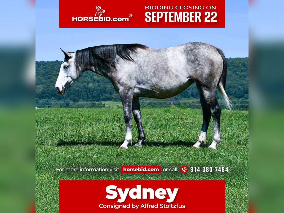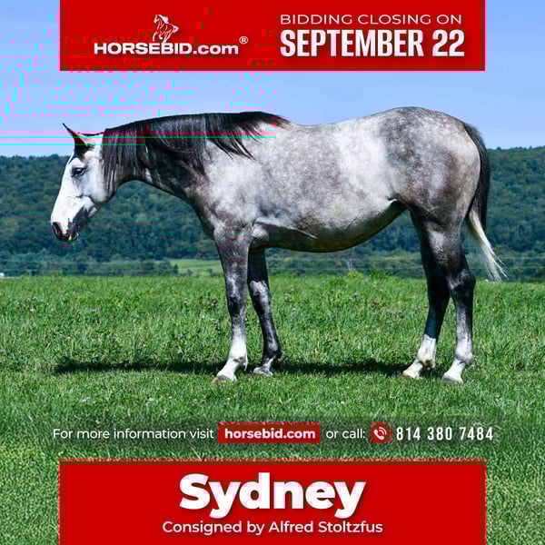 🍁𝒕𝒉𝒆 𝐅𝐀𝐋𝐋 𝑺𝒑𝒆𝒄𝒕𝒂𝒄𝒖𝒍𝒂𝒓🍁 Happening now thru MONDAY | SEPTEMBER 22nd - Available EXCLUSIVELY on HorseBid's website! For more details and to register visit: www.Horsebid.com CONSIGNOR CONTACT: Alfred Stoltzfus 814 380 7484 LOCATION: Howard, PA BREED: Draft cross REGISTERED: No COLOR: Gray HEIGHT: 16 AGE: 4 GENDER: Mare Sydney is a 4yr old draft cross mare that is very well broke to ride. She has a smooth walk trot and canter. Sydney has been on trail rides in the mountains and goes wherever you point her, through water, over logs and brushy terrian. The first time that we had Syndey in water my 5 yr old daughter rode her in the creek and she didnt hesitate at all. Sydney is very gentle and has a loving attitude. She loves attention and walks up to you in the pasture everytime you call her. Sydney has been exposed to tarps, bouncy balls and carries the flag. She has been on a 3 day trail ride and has taken it all in stride. Sydney stand to be mounted, tacked up and to be bathed and shod. Our 5 yr old daughter has ridden her in the arena and all over the farm. Sydney is puppydog gentle making her a great partner for almost anybody to ride. Sydney rides great in or outside the arena and picks up both her leads. She does well in a stall and gets along with other horses in the pasture. She is up to date on farrier, dewormer and had her teeth done this summer. Sydney rides out alone or in a group and is very easy to ride. She is more whoa than go and she is quite content to go for a leisure trail ride. She sells 100% safe and sound! If you have more questions or would like to see her in person call 814 380 7484 We can help with any transportation needs.