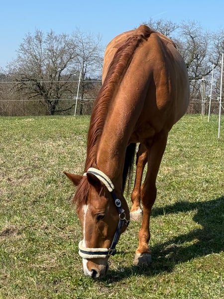 Zum Verkauf steht die hübsche und vielseitige Schweizer Warmblutstute Indira VII (Jg. 2013, ca. 173 cm Stockmass). Indira bringt Turniererfahrung bis 1.05 m mit und wird aktuell auf 80/85 cm vorgestellt. Sie ist sowohl in der Dressur als auch im Springen sowie im Freizeitbereich vielseitig einsetzbar. Auch im Gelände zeigt sie sich zuverlässig – egal ob alleine oder in Begleitung, sie meistert Ausritte souverän und gelassen. Interessanterweise ist sie auf Turnieren oft ruhiger als zuhause. Sie kennt verschiedene Plätze und Bedingungen (Halle, Sand, Wiese) und passt sich gut an. Im Umgang ist sie schmiedefromm und grundsätzlich unkompliziert. Das Verladen funktioniert mit Trense problemlos, ohne Trense benötigt sie noch etwas Übung. Gesundheitlich sind keine bekannten Befunde vorhanden. Indira ist eine liebevolle Stute, die eine enge Bindung zu ihrer Bezugsperson aufbaut. Hat man einmal ihr Vertrauen gewonnen, geht sie mit einem durch dick und dünn. Sie verfügt über viel Potenzial, das weiter gefördert werden möchte. Daher wünsche ich mir für sie einen fortgeschrittenen Reiter, der ihr gerecht wird und sie weiter ausbildet. Sie kennt verschiedene Haltungsformen, bevorzugt jedoch eine Auslaufbox. Preis: 15'000 CHF (verhandelbar) Material kann gegen Aufpreis übernommen werden. Ein Probereiten ist nur bei ernsthaftem Interesse möglich und gegen eine Gebühr von 25.- diese werden bei einem Verkauf abgezogen. Weitere Informationen und Videos gerne privat. Kontakt (WhatsApp): 079 882 61 11