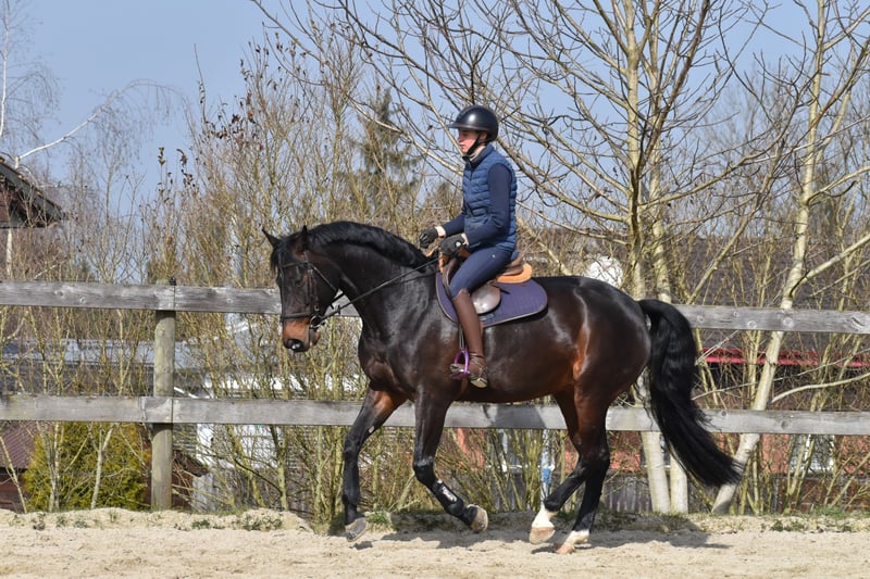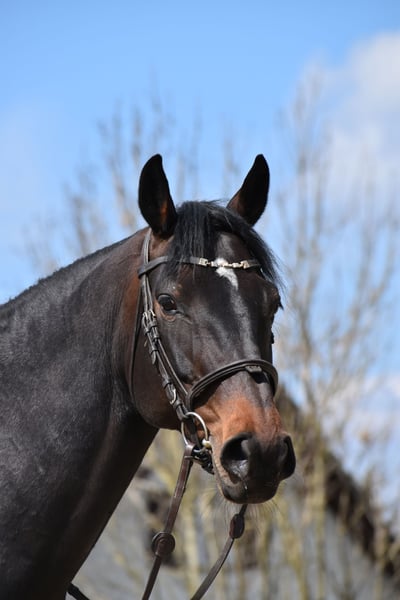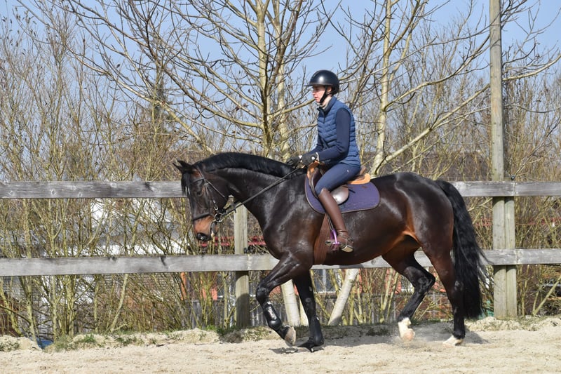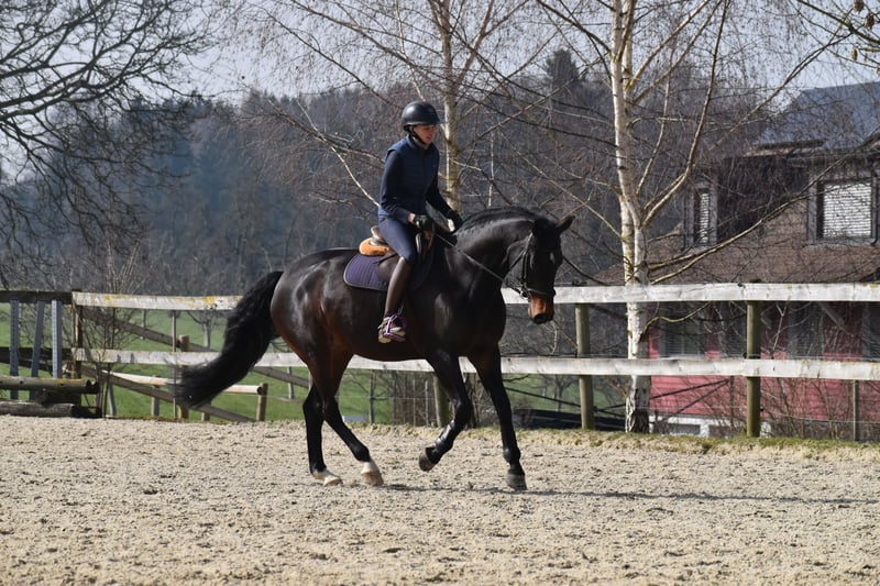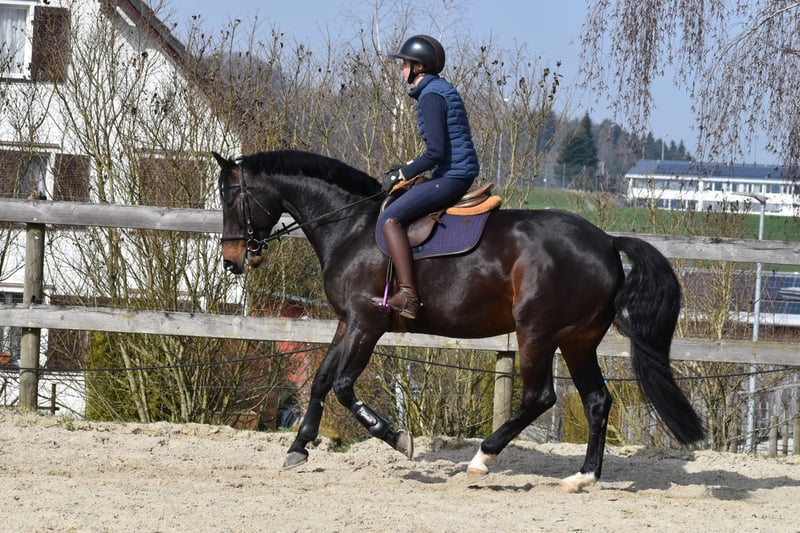 For sale: 7-year-old dark bay Diarado x Stolzenberg mare, 16.1 hh A suitable horse for the active leisure rider, energetic over fences, uncomplicated, and well-behaved in daily handling. Loads quietly and stands patiently for the farrier. Lively and interested in the field. Very affectionate, charming, and with a twinkle of mischief in her eye, making daily work with her a true pleasure.
