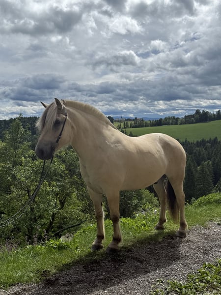 Laurin is a approximately 143 cm tall 5-year-old Fjord horse with a white coat. He was born in 2020 and has been living in our species-appropriate herd since then. In the herd, he is rather dominant. Laurin has been in training for a year now. We started groundwork earlier, so he knows the basics. When riding, he is well-behaved and shows good gaits. He is very sure-footed and loves to go on long, relaxed trail rides. We are not yet as advanced in the riding arena, but he is still in training and is developing every day. Due to his age, he is not suitable for beginners. He is very kind, even with children, and loves to cuddle with them. Laurin needs a consistent but loving and patient owner who spends a lot of time with him regularly. Laurin is a very people-oriented and affectionate horse who enjoys closeness. He is also very well-behaved with the farrier, but he has never been shod as he has good hooves. There have never been any problems with trailer loading either. Laurin can be viewed and tried out for riding by appointment. We are also happy to send current videos upon serious interest. Please feel free to contact us for more information.