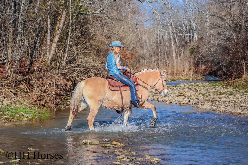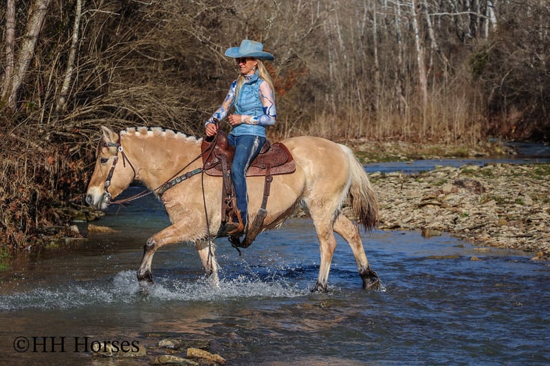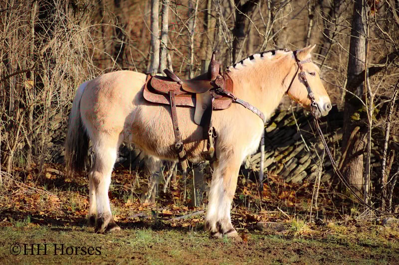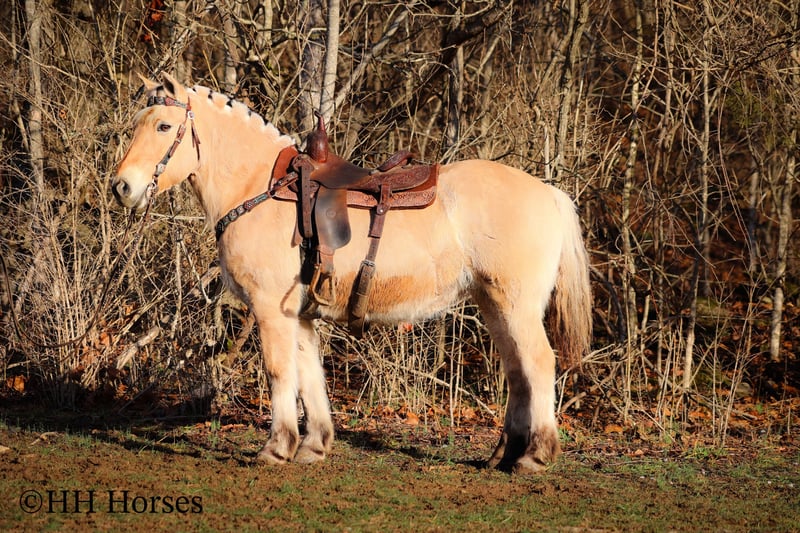 ONLINE AUCTION Place your bids at www.PlatinumEquineAuction.com Starting Bid $3500 Auction ends February 23rd, 2025 Need a new saddle? Check out White Rock Saddles on our website or Facebook! This is “COUCH POTATO”, a family friendly, quiet, safe, and gentle PUREBRED NORWEGIAN FJORD MARE that has all the great characteristics of the wonderful breed. She is 14.2 hands tall and 12 years old. The Fjords are one of the oldest and purest breeds in the world. This mare has great agility, a strong neck, sturdy legs, and excellent feet. She is broke to ride and drive. This mare has been ridden by beginners and youth riders. She will not take advantage of her rider. She will only go as fast as she is asked to and she is patient. She stands to harness, tack, mount, hitch, and groom. She loads, bathes, stands tied, and hauls with no fuss. She will trail ride anywhere you want to go quietly under saddle or harness. She will cross any depth of water and she is extra sure footed. She is cautious, kind, confident, and fun. She is safe for beginner teamsters and is uber user friendly to harness and drive. She is traffic safe and has been in holiday parades, wagons trains, and weekend camping trips. She has pulled a cart, sleigh, wagon, and farm machinery. She is broke nice and any level equestrian can appreciate how nice she is trained and how well she carries herself. She is a big comfy couch to ride, being extra smooth and keeping herself well balanced when maneuvering through rough, rocky, and steep terrain. She is a great horse for anyone to enjoy. Located in Flemingsburg, KY. For more info or to make a BUY IT NOW offer contact HH Horses Erin 304-238-4155. ONLINE AUCTION Place your bids at www.PlatinumEquineAuction.com Starting Bid $3500 Auction ends February 23rd, 2025 Need a new saddle? Check out White Rock Saddles on our website or Facebook!