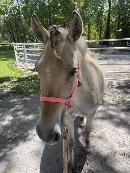 Hemming's Nora is a beautiful yearling with excellent conformation, and a solid foundation started. Her Training includes desensitization to tarps,whips,jugs,bags,flags,umbrellas,balls,blow up costumes, she will walk over mattress, tarps and loves to stand on the pedestal. She has had a light saddle on at the walk trot and canter with no issues and will be easy to break when she grows enough to be ridden. she loads in the trailer with ease and stands patiently on the crossties for grooming, farrier, vet, bathing, and body clipping. she loves attention and is gentle as well as respectful with both adults and children. with her life just starting and a well-placed foundation she will make someone a wonderful lifelong partner.