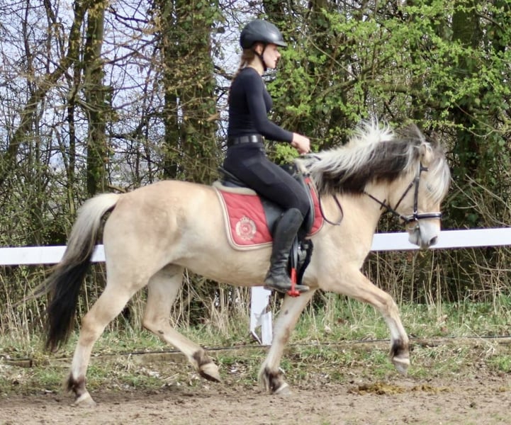 For Sale: Fjord Pony – Young, Charming Mare for Leisure Riding Coming directly from the breeder, meet MAGDA, a beautiful purebred Fjord mare with excellent pedigree. Magda was raised in a Fjord herd under species-appropriate and breed-appropriate robust management. She is a medium-sized pony with no social issues. Currently, she lives in her training stable within a mixed herd of Fjord ponies and riding ponies, in a combination of box stalls (at night) and a large pony group outside during the day. She is barefoot and has very good horn growth. This young Fjord mare is curious and extremely friendly in her interactions. She is very relaxed during groundwork and always positive when faced with new tasks! She was very easy to ride when initially backed and can now be ridden in all three basic gaits free. However, we do not recommend her for beginners yet, as her fundamentals should be further reinforced, and Magda’s work enthusiasm should be nurtured! She will develop into a very fine riding pony, demonstrating all the advantages of a Fjord. She has already participated in her first group rides and was very well-behaved throughout. She currently measures approximately 1.40 meters (about 14.1 hh), which suits her very well. The rider in the photos and videos is 1.70 meters tall. Please feel free to contact us if you would like more information about this sale pony. The mare is located with our former apprentice, who specializes in this breed. You are welcome to meet her in person!