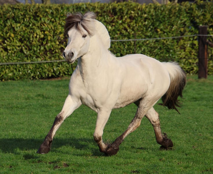 Utis is a beautiful, well-built 3-year-old white Fjord stallion. He moves very well! He is approved for breeding in Wickrath at the end of 2025. Utis is an easy stallion to handle and is an intelligent horse that enjoys working. He is broke to drive in a pairs. He is currently approximately 1.43 meters tall. He can be castrated if wanted.