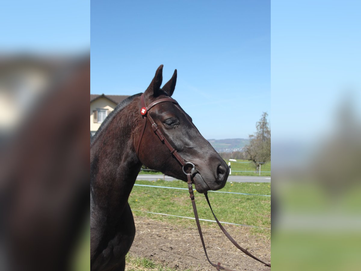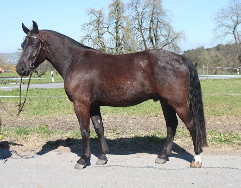 Beautiful Freiberger gelding in a dark coat. 15.7 hands tall. Pedigree: Navarino / Nejack The gelding is very calm and composed in handling. He has completed the field test and is now being used appropriately for his age. He is mainly ridden in the terrain and driven in a two-in-hand. He is regularly worked on lungeline and in the riding arena. He resides on a farm bustling with activity: machinery, large tractors, and playing children – all part of his daily environment. He lives in a group setting, where he is right in the middle of the hierarchy and displays typical gelding playfulness.