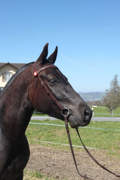 Hermoso caballo de Freiberger en pelaje oscuro. Mide aproximadamente 1,57 m. Pedigrí: Navarino / Nejack El caballo demuestra una actitud muy tranquila y serena en su manejo. Ha pasado la prueba de campo y actualmente se le está utilizando de acuerdo a su edad. Principalmente se le monta en el campo y se le conduce en carreta en tándem. También se trabaja con él en la cuerda y en el paddock de doma de forma regular. Vive en una explotación agrícola con mucho movimiento y alegría: máquinas, grandes tractores y niños jugando, todo esto forma parte de su día a día. Se encuentra en un grupo de estabulación, donde ocupa una posición intermedia en la jerarquía y muestra un carácter muy juguetón, típico de un caballo gelding.