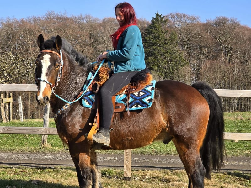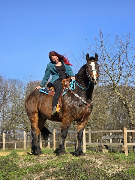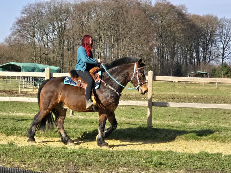 Kräftiger Freiberger–Ardenner Mix Wallach – brav geritten & gefahren Alter: 9 Jahre 25.4.2017 Stockmaß: ca. 157 cm Preis: 6900,- AKU: vorhanden ✨ Beschreibung: Dieser 9-jährige Freiberger–Ardenner Mix Wallach überzeugt mit seinem kräftigen, stabilen Körperbau und seinem absolut ausgeglichenen Charakter. Er ist ein zuverlässiger Partner im täglichen Umgang – freundlich, ruhig und unkompliziert im Stall sowie beim Putzen und Führen. Unter dem Sattel zeigt er sich brav und angenehm zu reiten. Er geht fleißig vorwärts, bleibt dabei stets kontrollierbar und vermittelt seinem Reiter ein sicheres Gefühl. Auch gefahren ist er und kennt die Arbeit vor der Kutsche. Dabei präsentiert er sich zuverlässig,und arbeitswillig. Ein vielseitiger Freizeitpartner mit Substanz – ideal für Reiterinnen und Reiter, die ein kräftiges, gutmütiges Pferd suchen. Geeignet für: Freizeitreiter, Wiedereinsteiger oder Fahrer, die einen stabil gebauten, geländesicheren und zuverlässigen Wallach suchen. Auch für kräftigere Reiter bestens geeignet. Unsere Pferde werden regelmäßig: – entwurmt – vom Schmied betreut – osteopathisch kontrolliert Hofladen: Westernsättel, Trensen & Zubehör Transport sowie passendes Equipment auf Wunsch günstig organisierbar Unser Service: ✅ 3 Monate Umtauschrecht ✅ Proberitt: 35 €, jedes weitere Pferd 25 € (beim Kauf am selben Tag angerechnet) ✅ 100 € Sofort-Rabatt bei Abholung oder Transport am gleichen Tag ✅ Persönliche & ehrliche Beratung Anfragen bitte ausschließlich telefonisch: 0171 – 4001968 Erreichbar täglich von 8–20 Uhr ⚠️ Keine E-Mail oder WhatsApp ⚠️ Alle Angaben ohne Gewähr